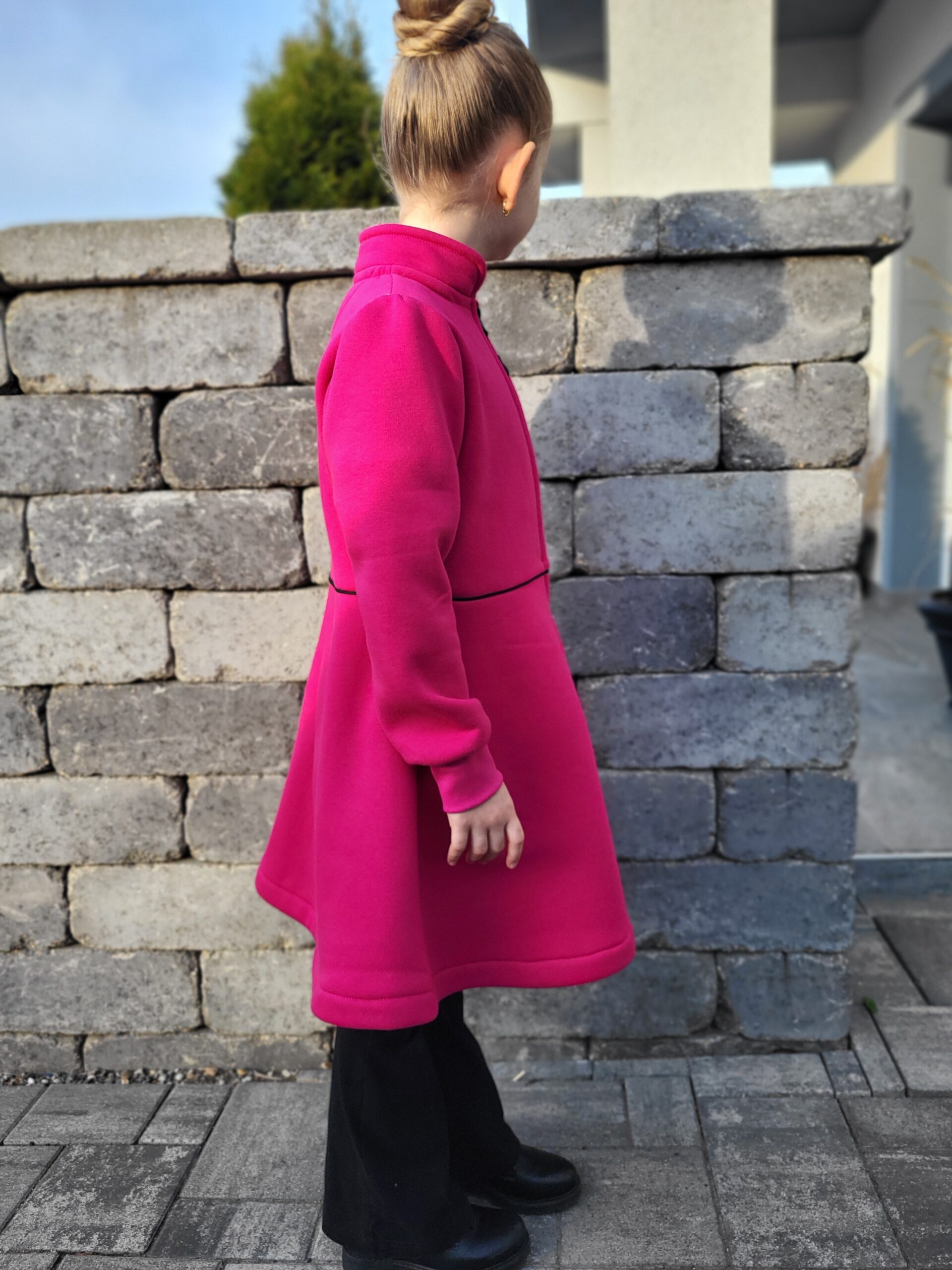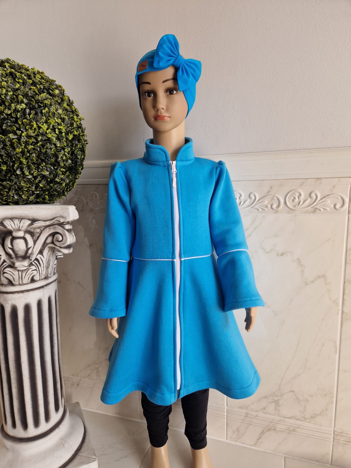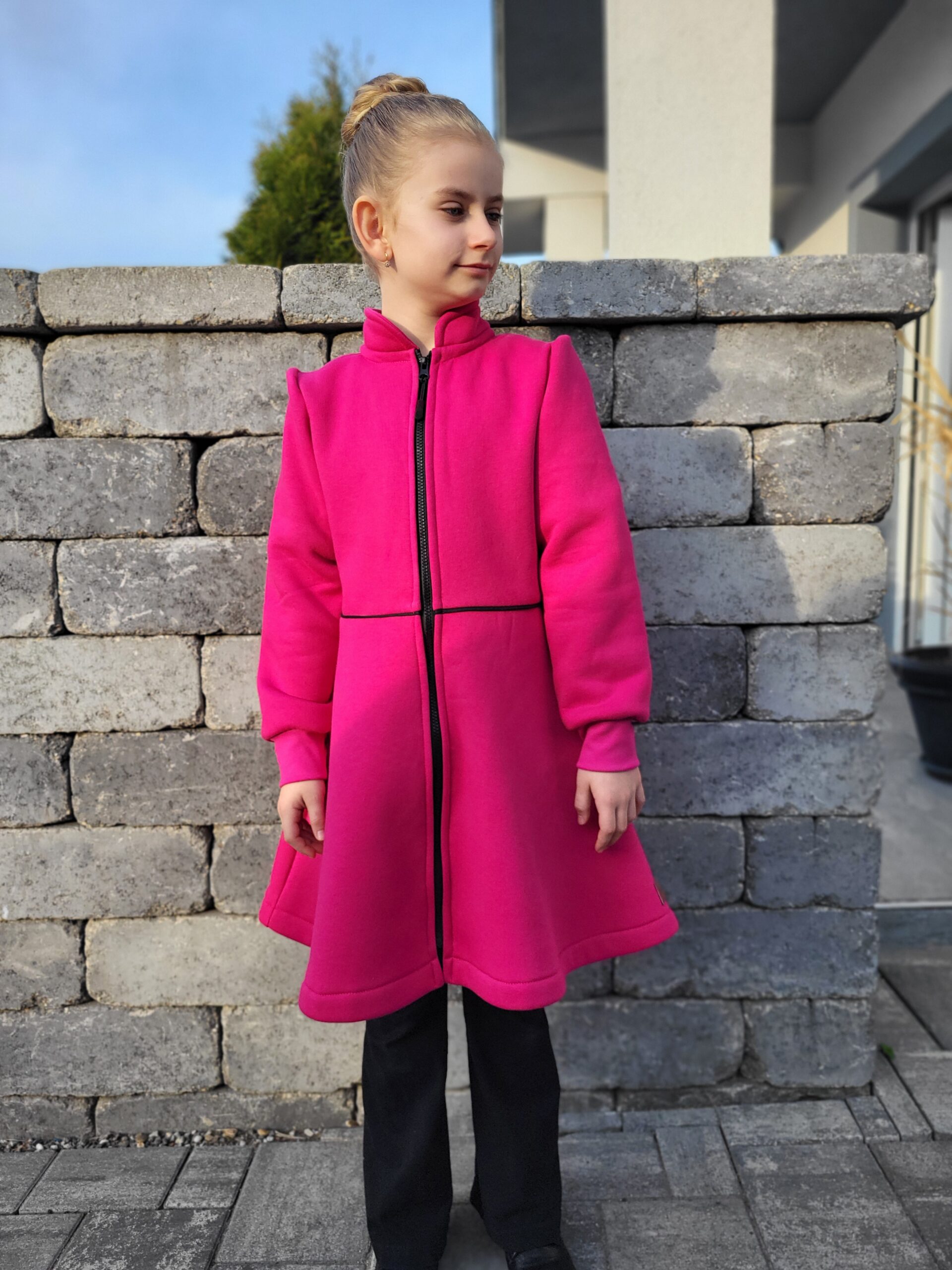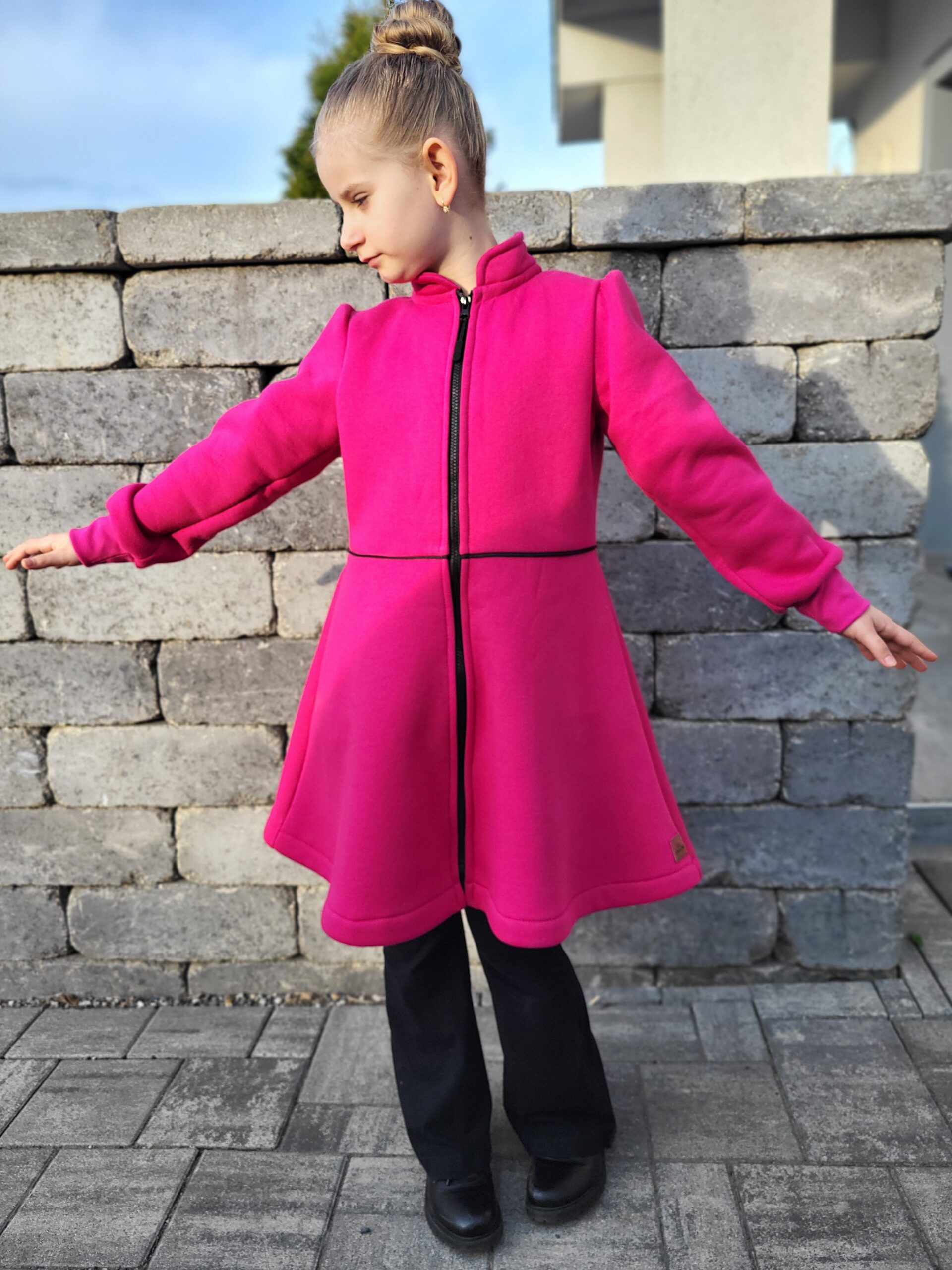Kabátik je elegantný, prestrihnutý v páse sukňového stihu. Zvonové rukávy, riasené na pleci. Zapínanie je na zips so stojačikom. Perfektne sedí, je pohodlný. Ukončenie rukáva je možné aj manžetou. Ku kabátiku si môžete doladiť čelenku, legíny, čiapku…