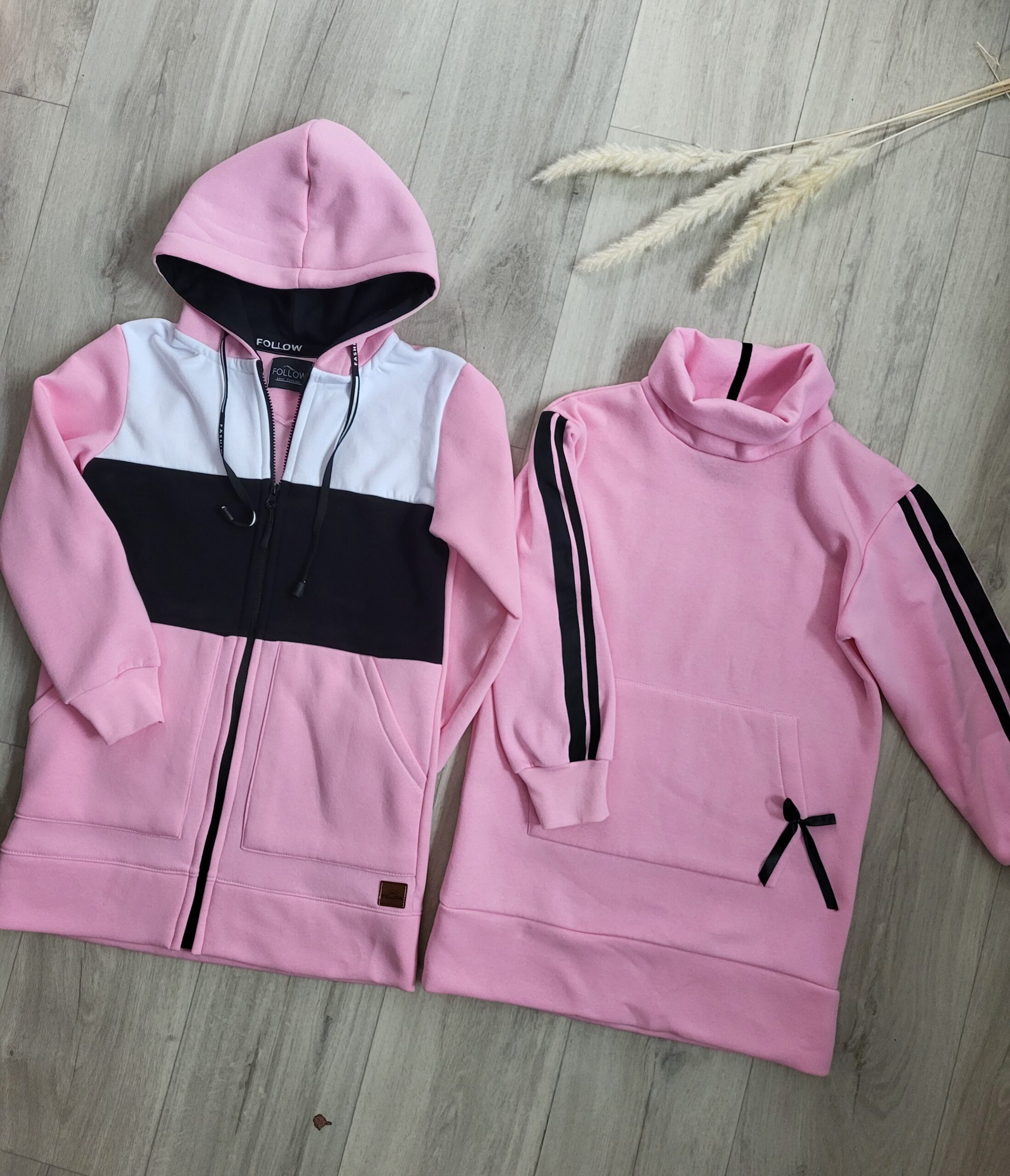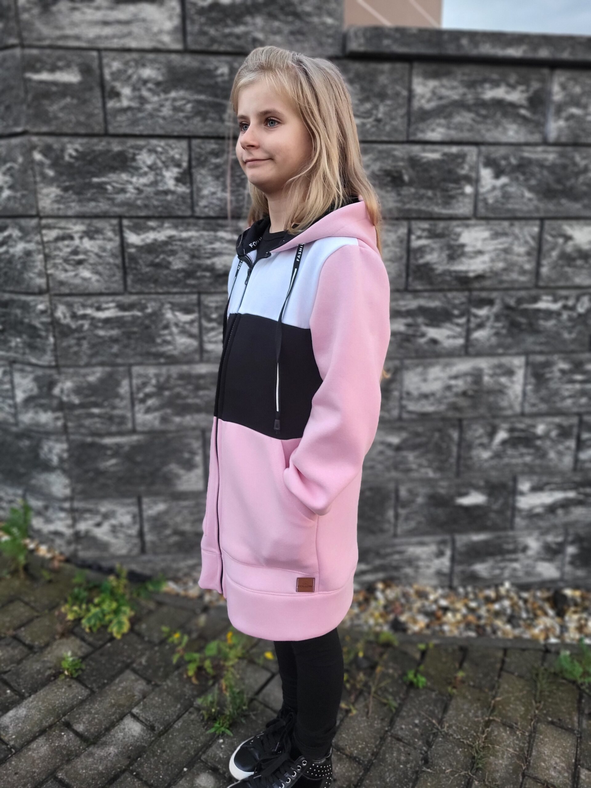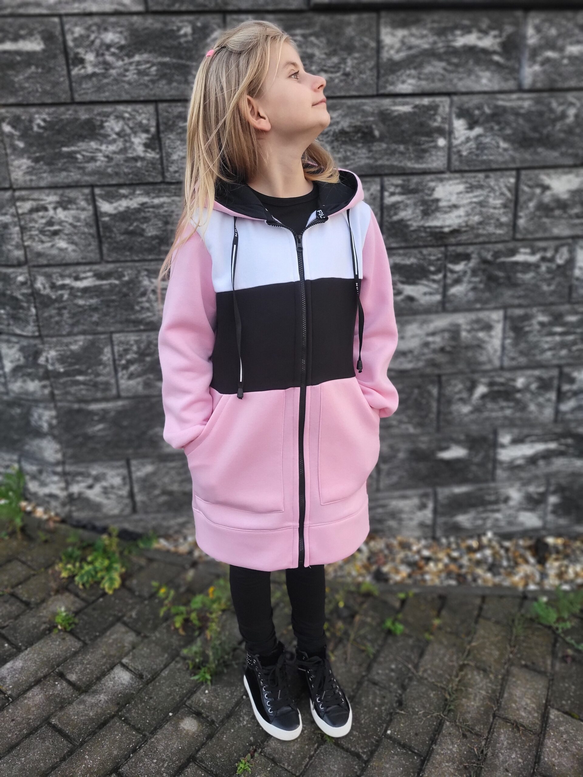Mikina je predlženého strihu, s vreckami a kapucňou. Zapínanie je na zips. Perfektne sedí, je teplá a pohodlná. K mikine si môžete doladiť legíny aj čiapku