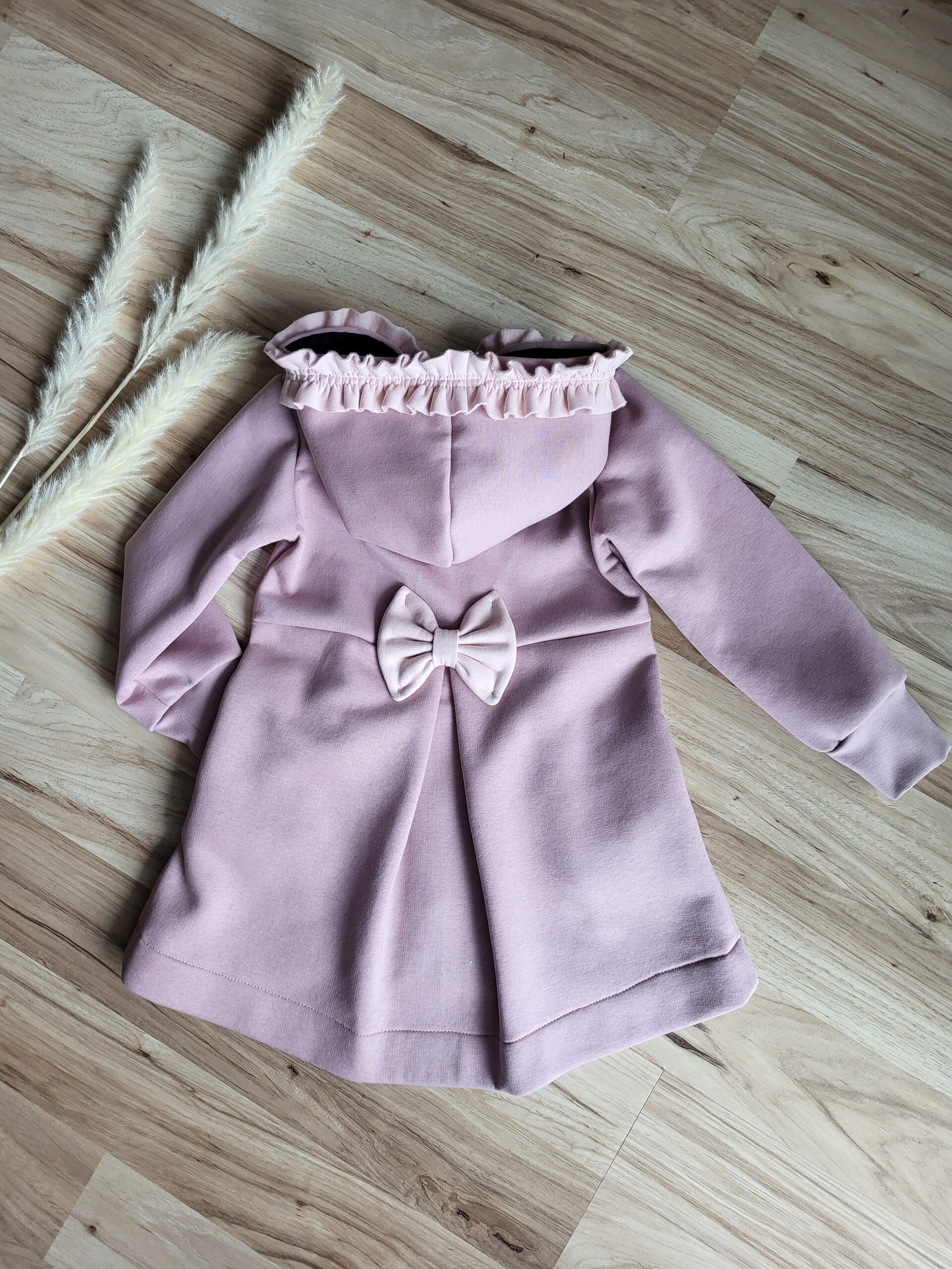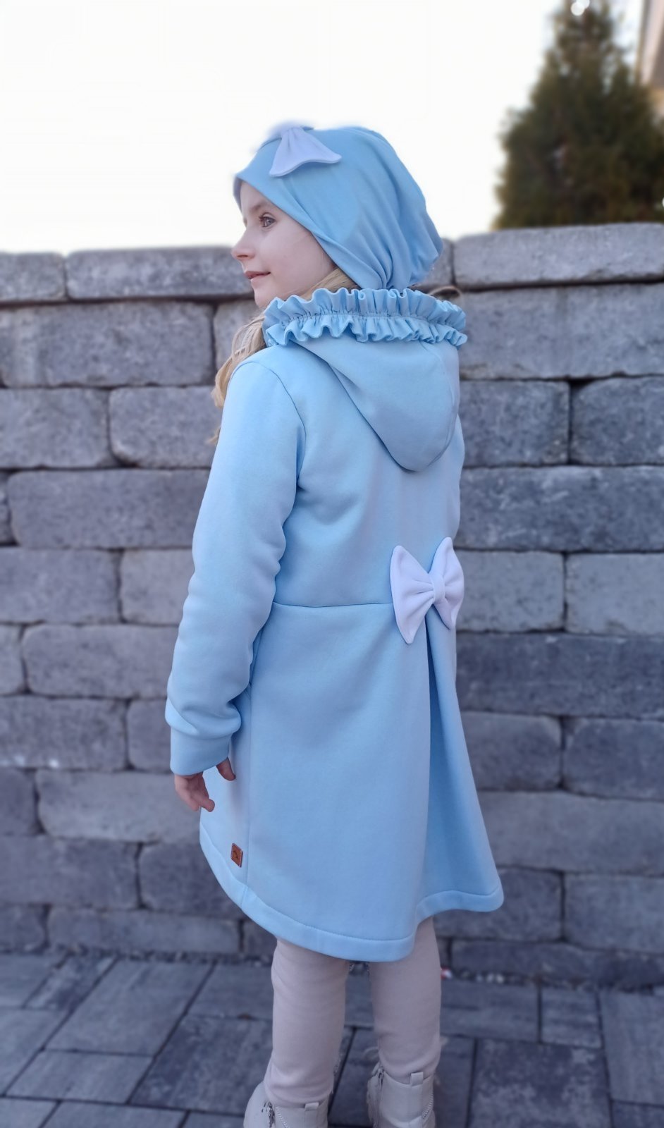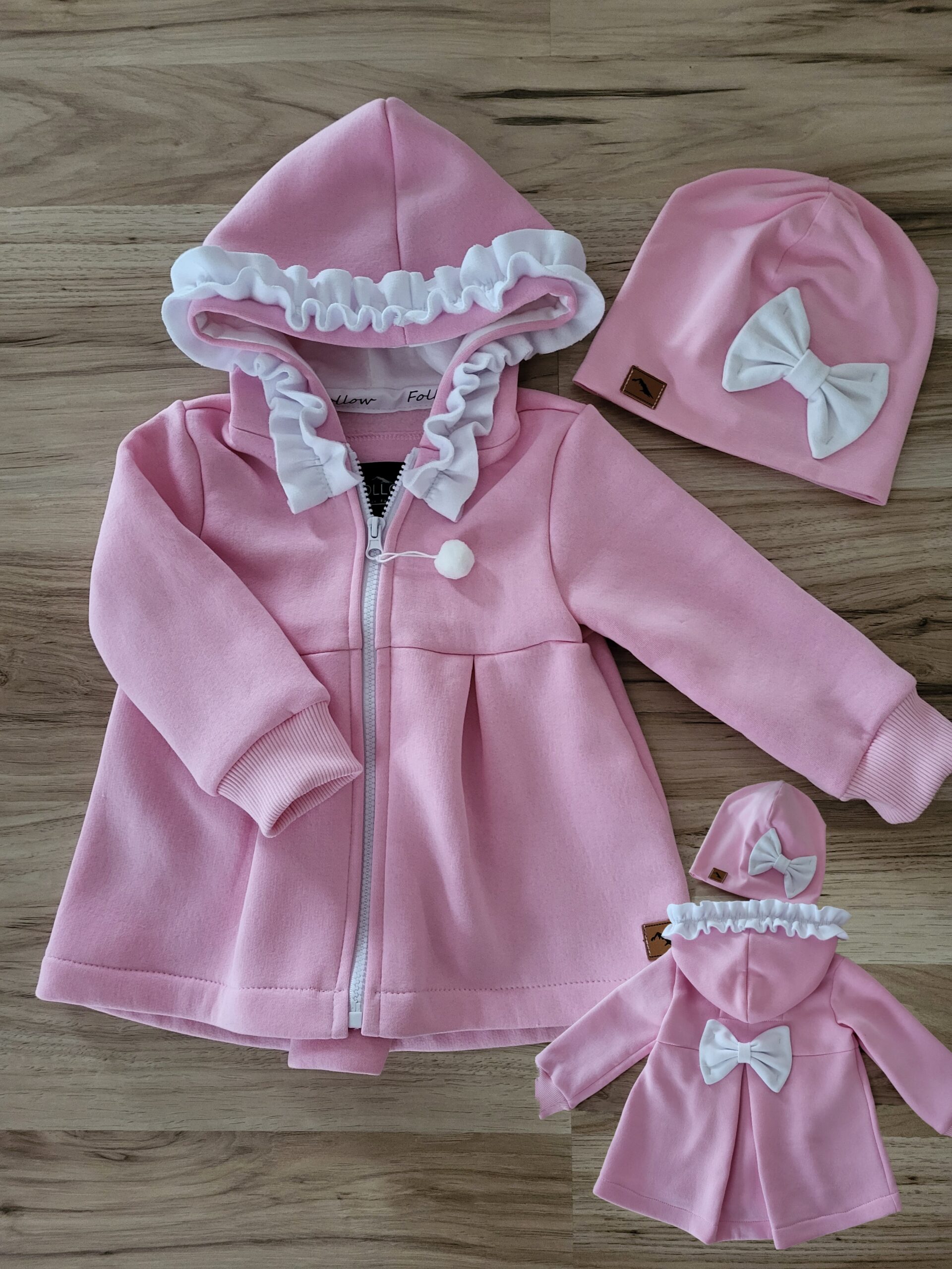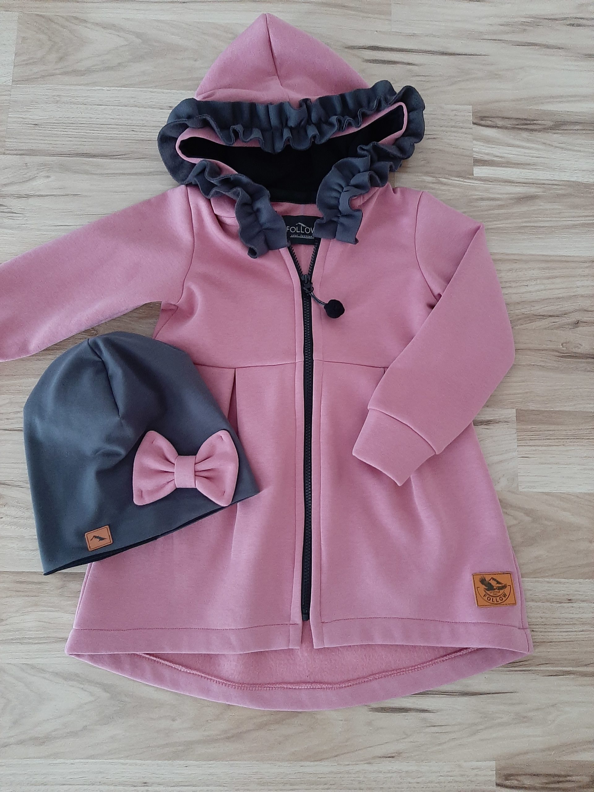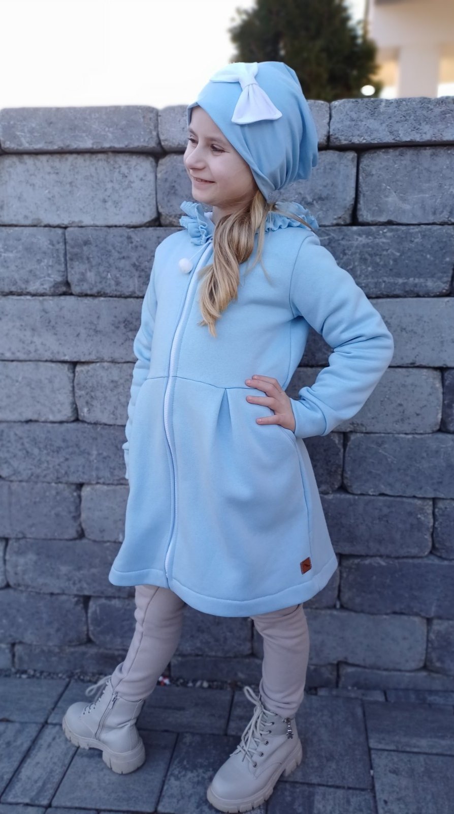 Kabátik je elegantný, predlženého strihu s vreckami, prestrihnutý v páse so záhybmi a s kapucňou. Rukávy sú ukončené manžetou. Je ozdobený riasenkou a mašľou. Zapínanie je na zips. Perfektne sedí, je pohodlný. Ku kabátiku si môžete doladiť legíny/tepláky , čiapku