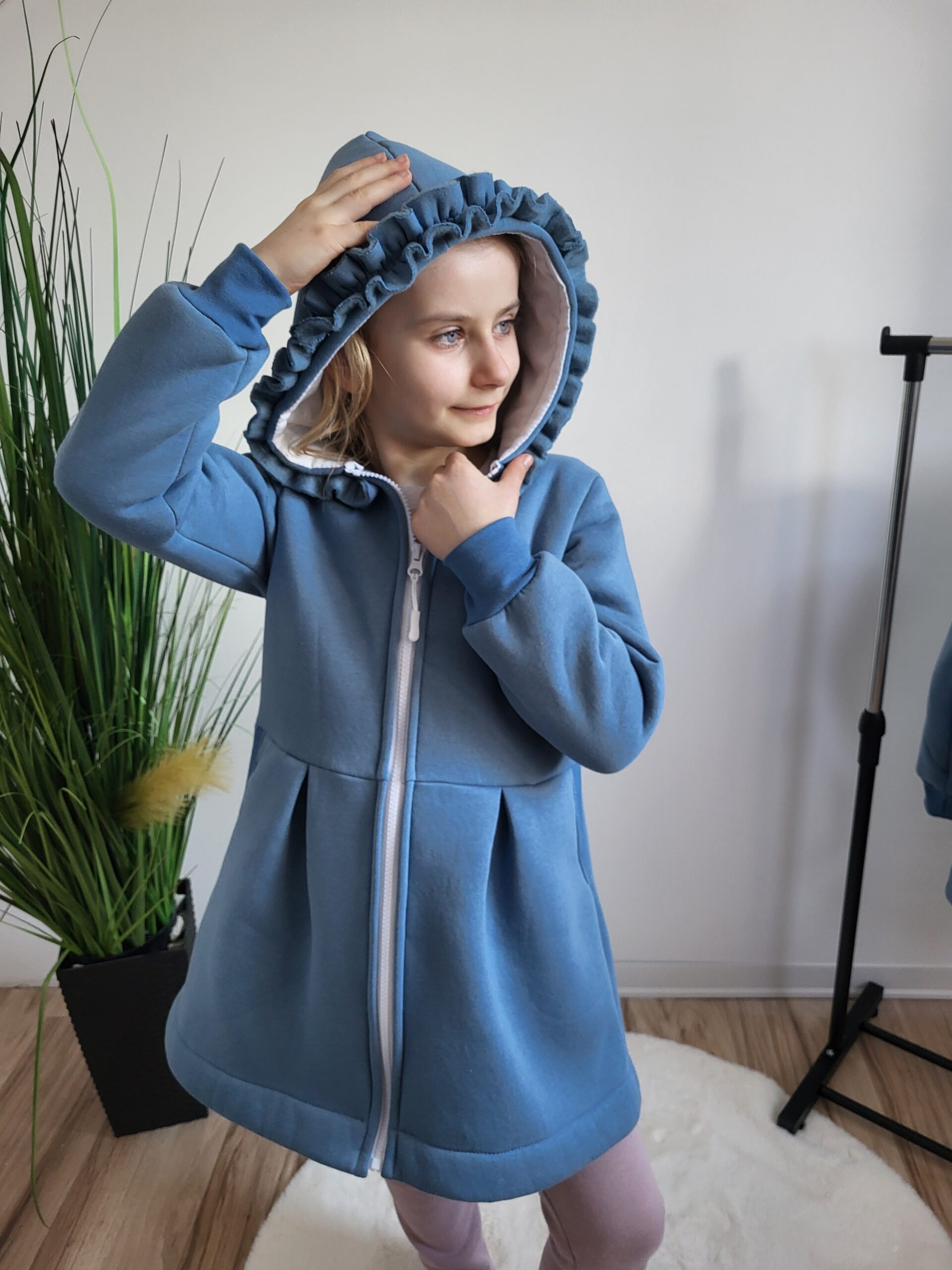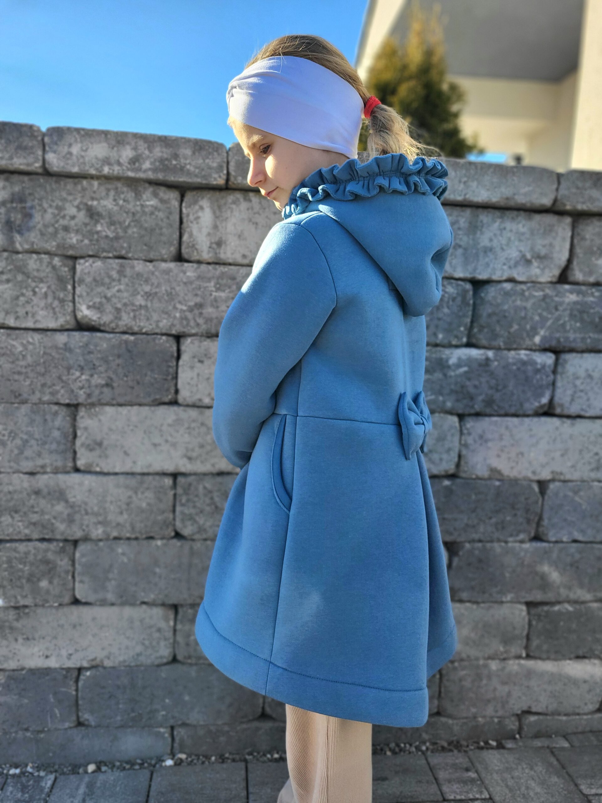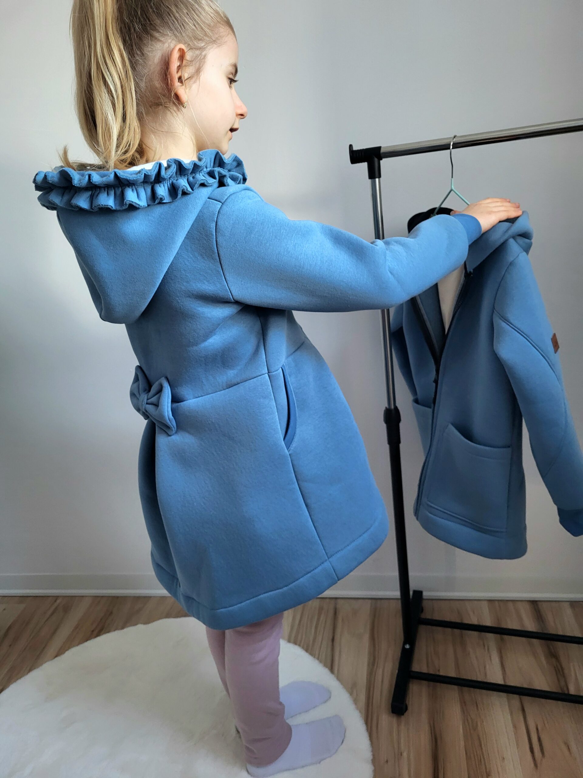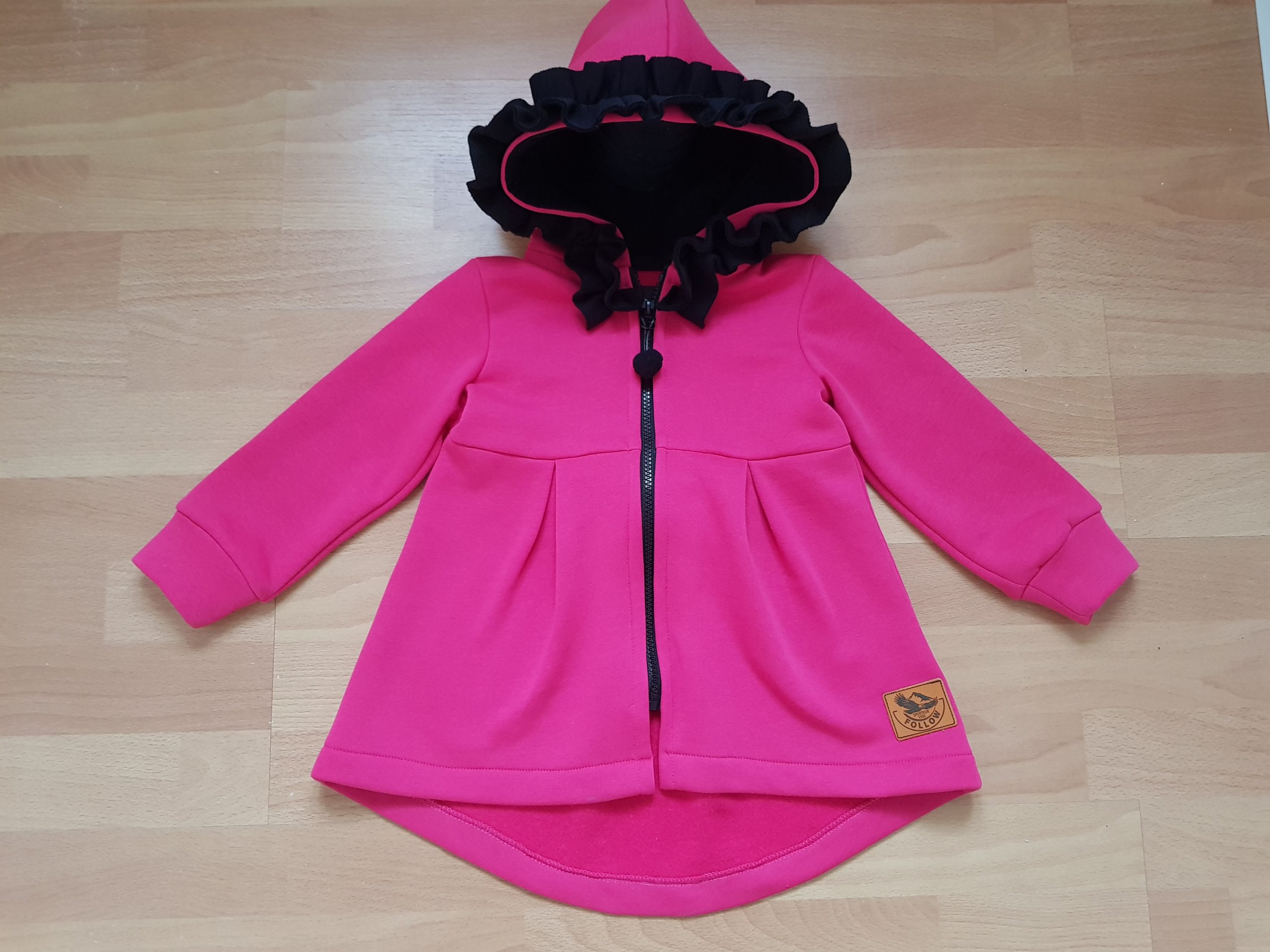 Kabátik je elegantný, predlženého strihu s vreckami, prestrihnutý v páse so záhybmi a s kapucňou. Rukávy sú ukončené manžetou. Je ozdobený riasenkou a mašľou. Zapínanie je na zips. Perfektne sedí, je pohodlný. Ku kabátiku si môžete doladiť legíny/tepláky , čiapku
