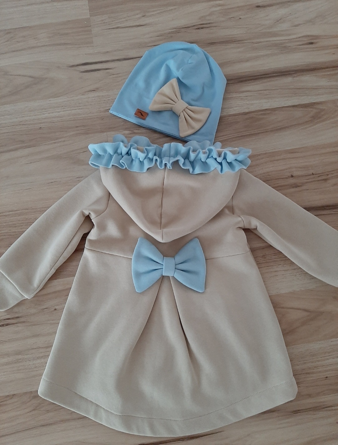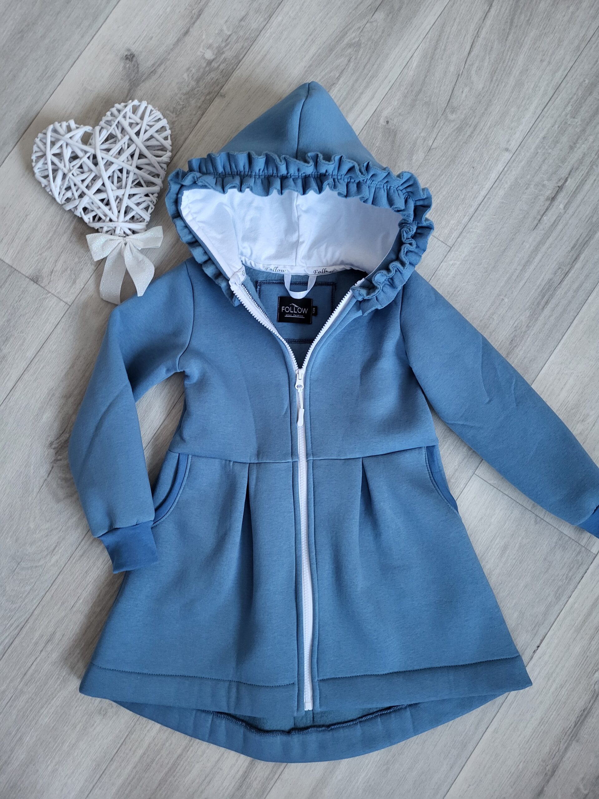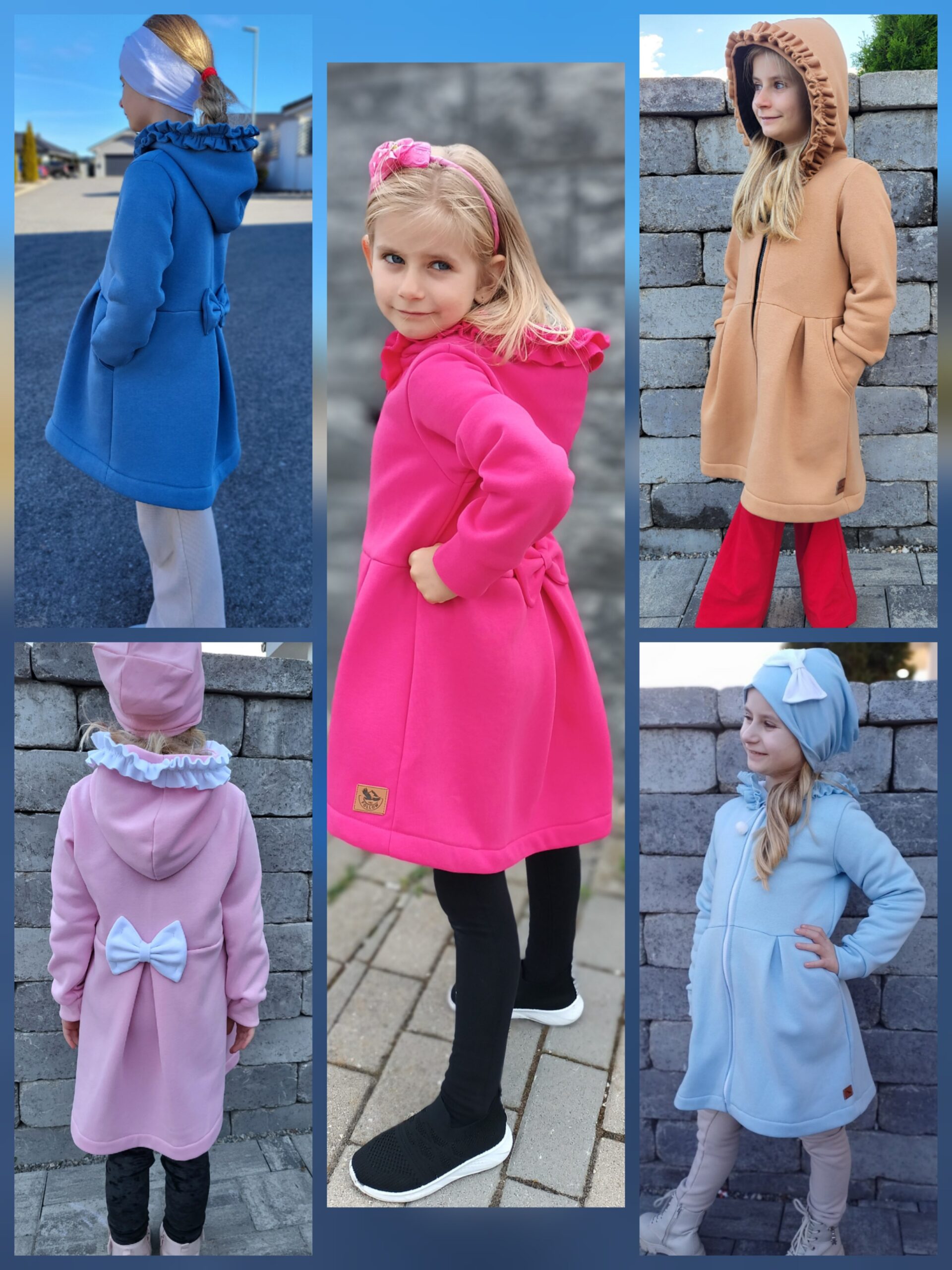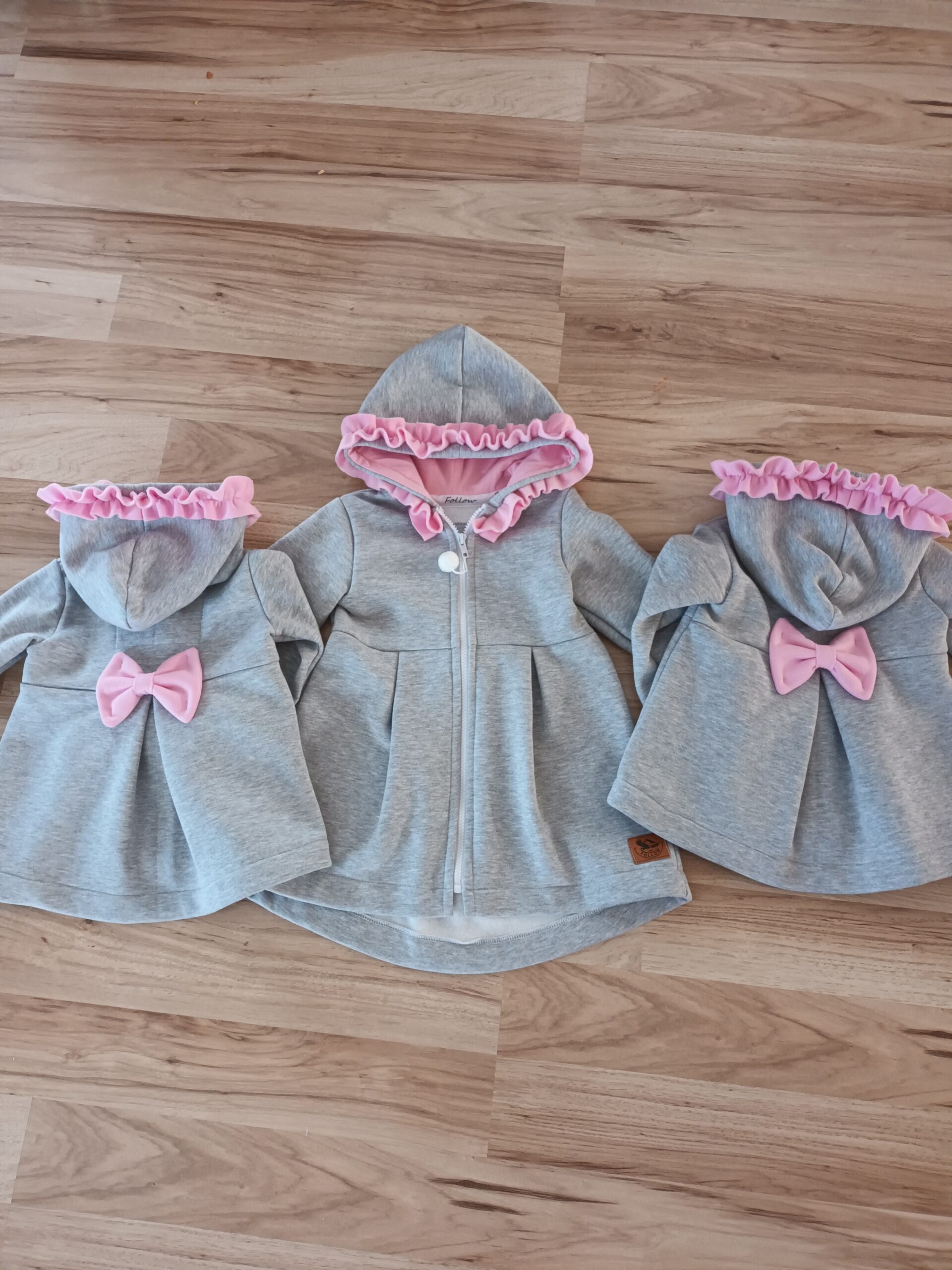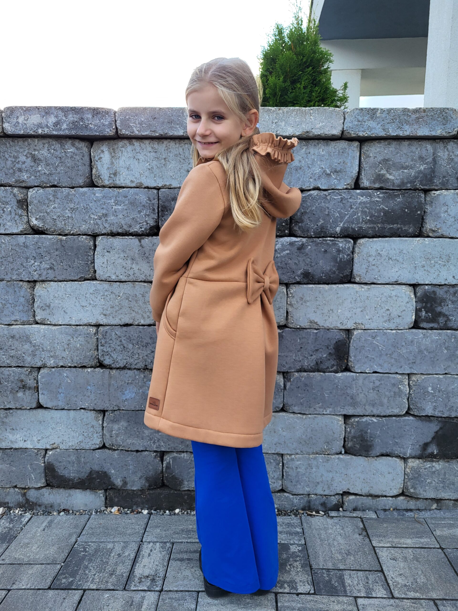 Kabátik je elegantný, predlženého strihu s vreckami, prestrihnutý v páse so záhybmi a s kapucňou. Rukávy sú ukončené manžetou. Je ozdobený riasenkou a mašľou. Zapínanie je na zips. Perfektne sedí, je pohodlný. Ku kabátiku si môžete doladiť legíny/tepláky , čiapku