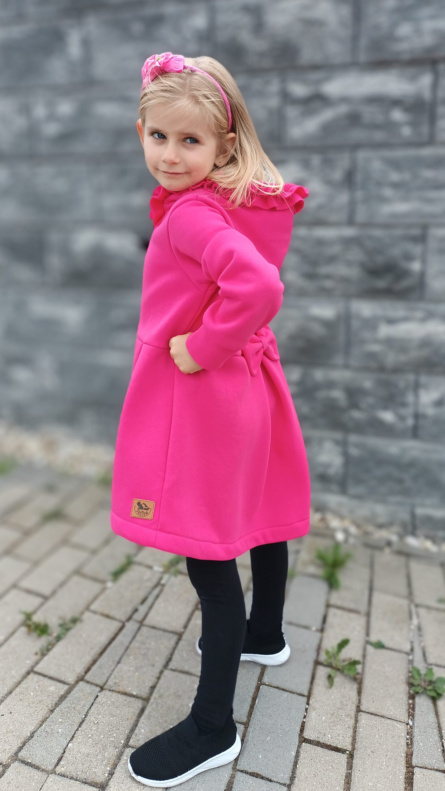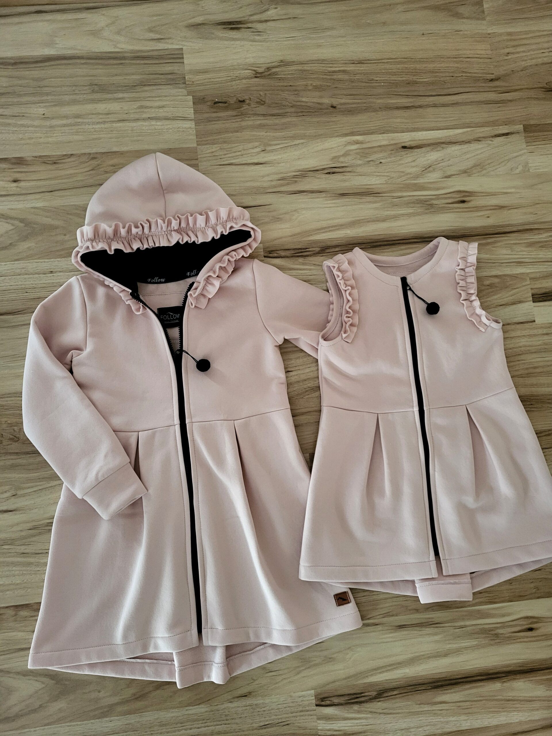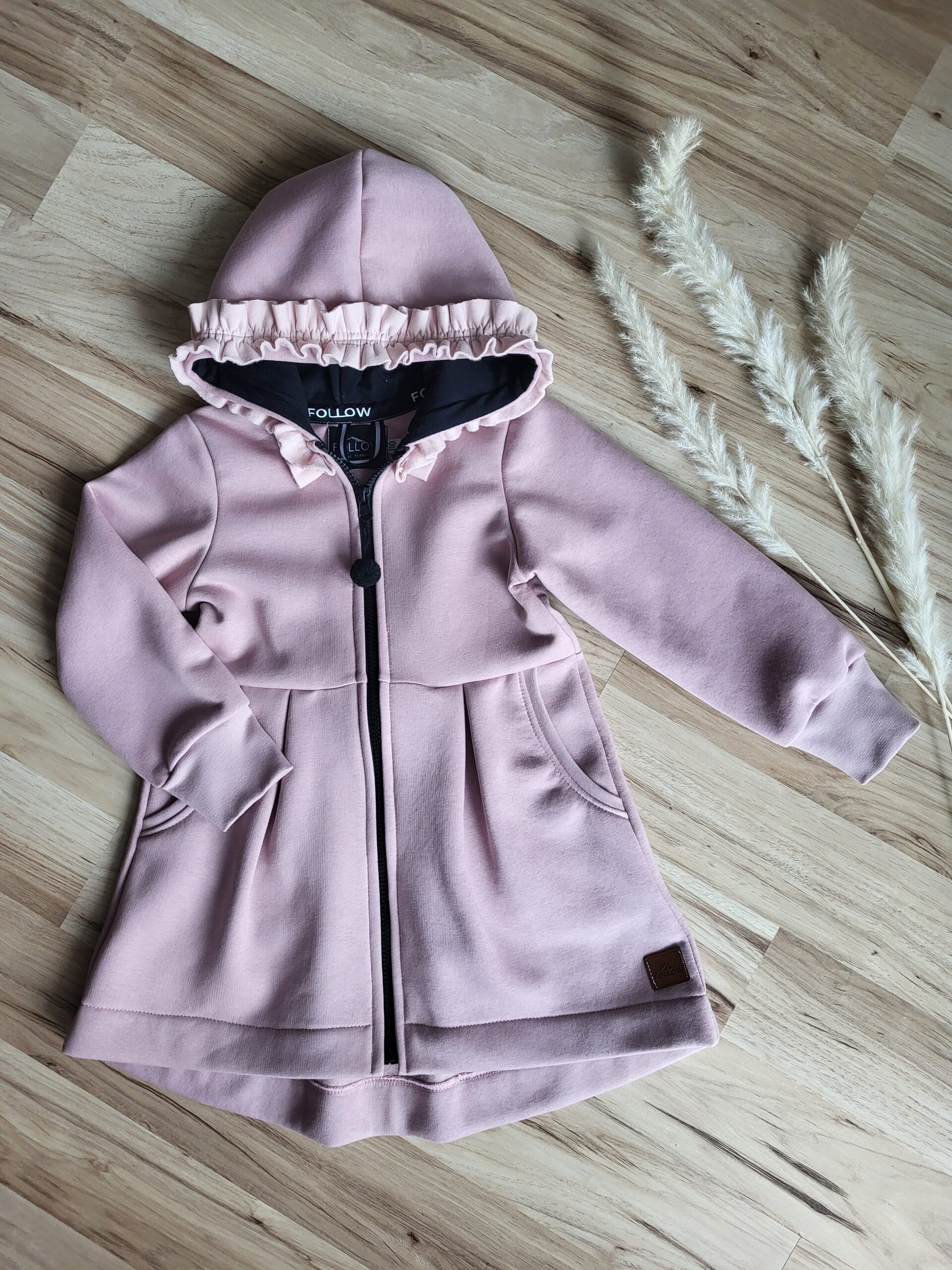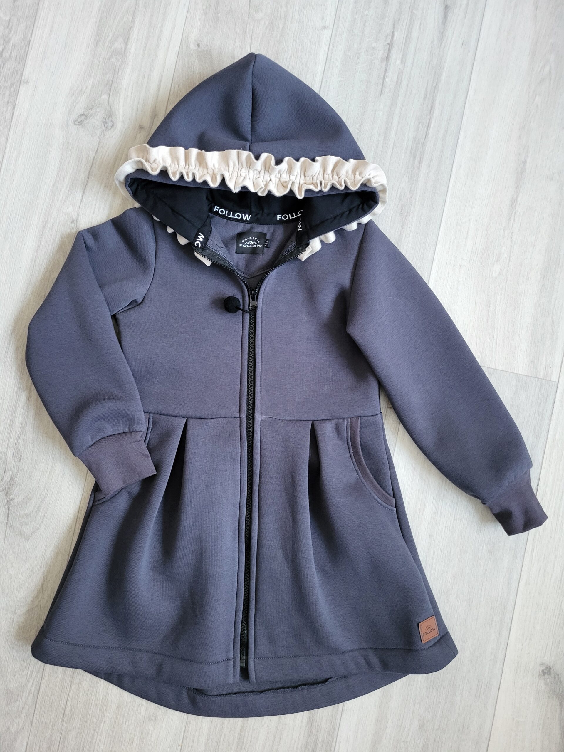 Kabátik je elegantný, predlženého strihu s vreckami, prestrihnutý v páse so záhybmi a s kapucňou. Rukávy sú ukončené manžetou. Je ozdobený riasenkou a mašľou. Zapínanie je na zips. Perfektne sedí, je pohodlný. Ku kabátiku si môžete doladiť legíny/tepláky , čiapku
