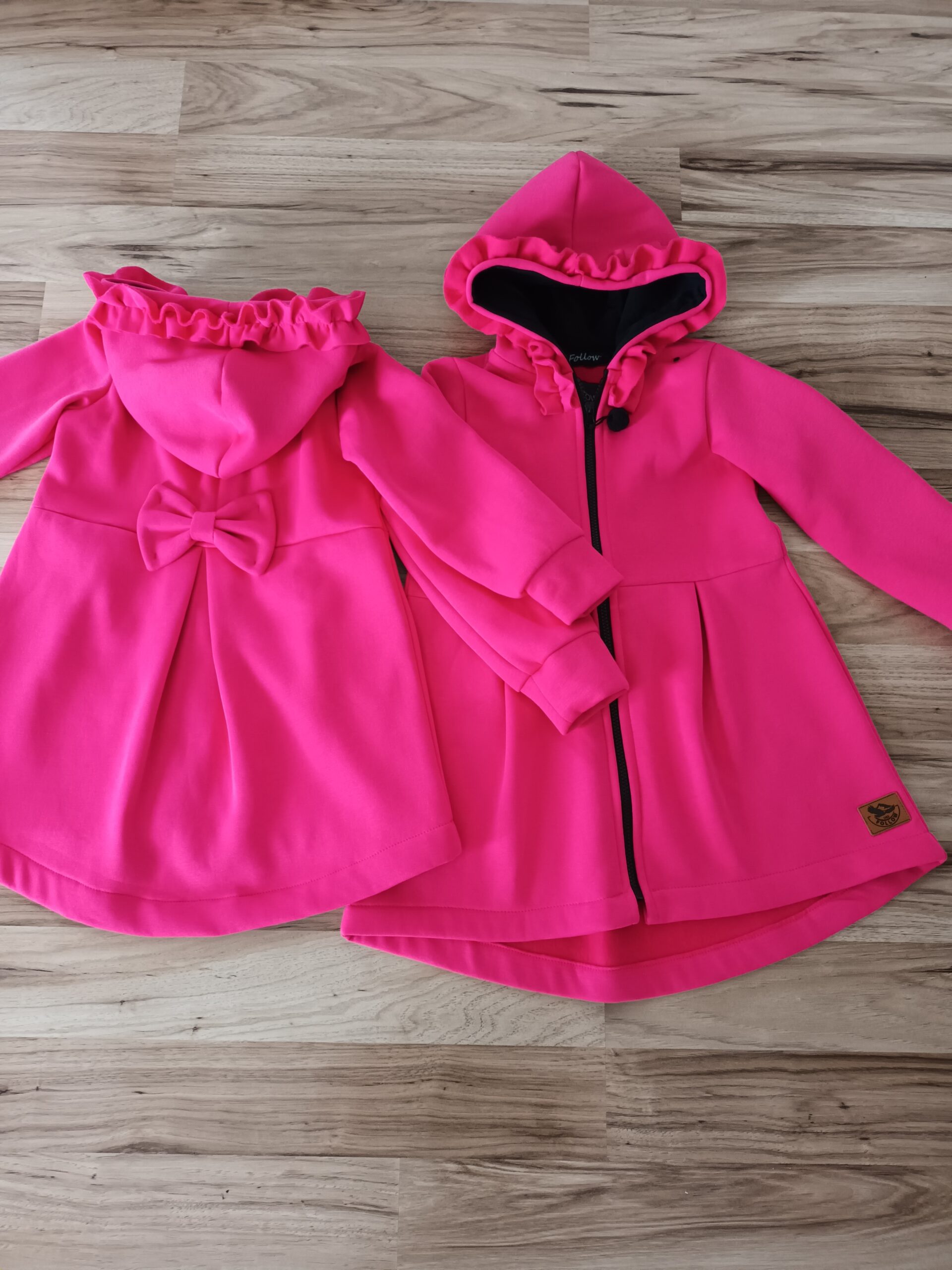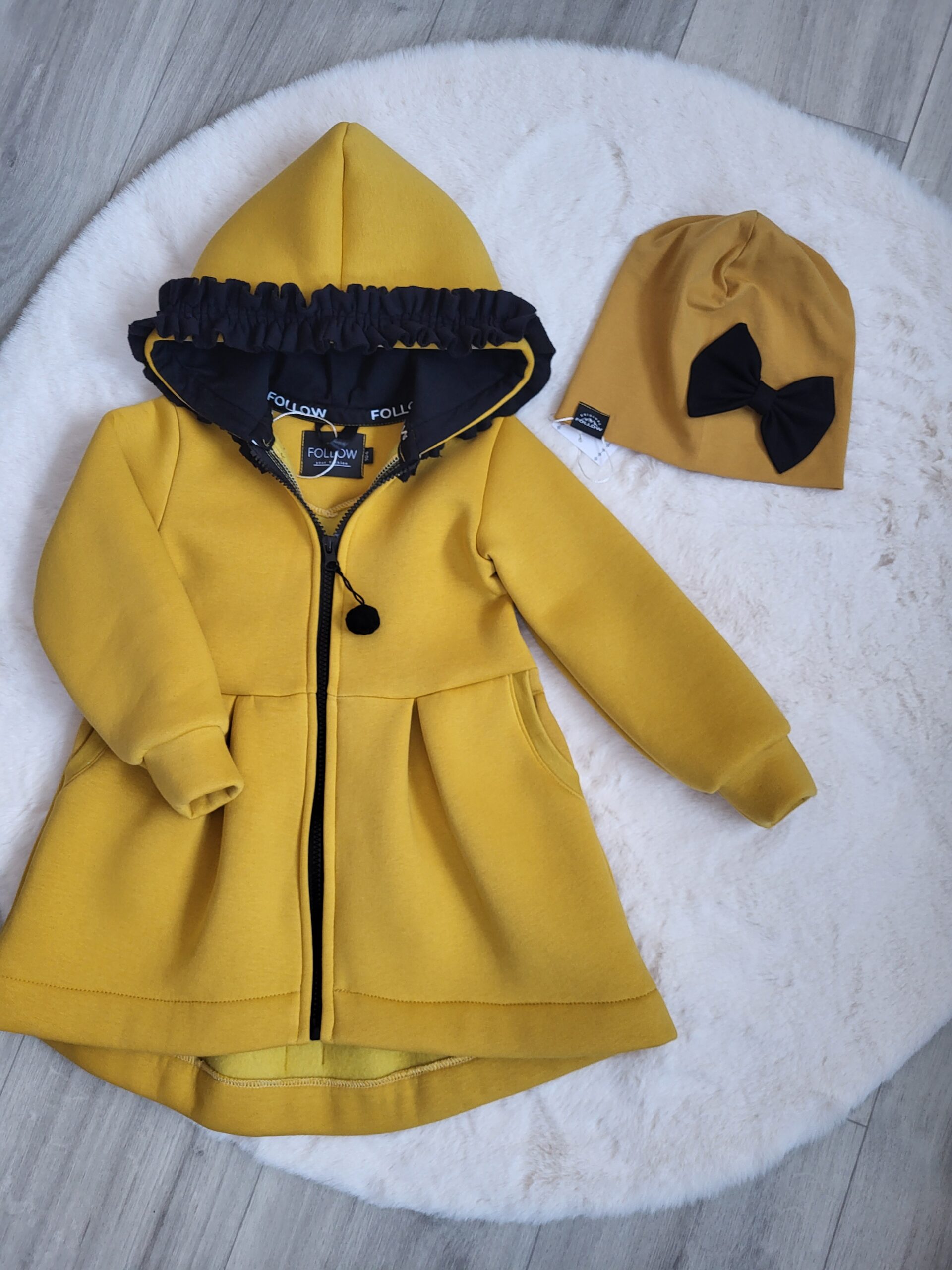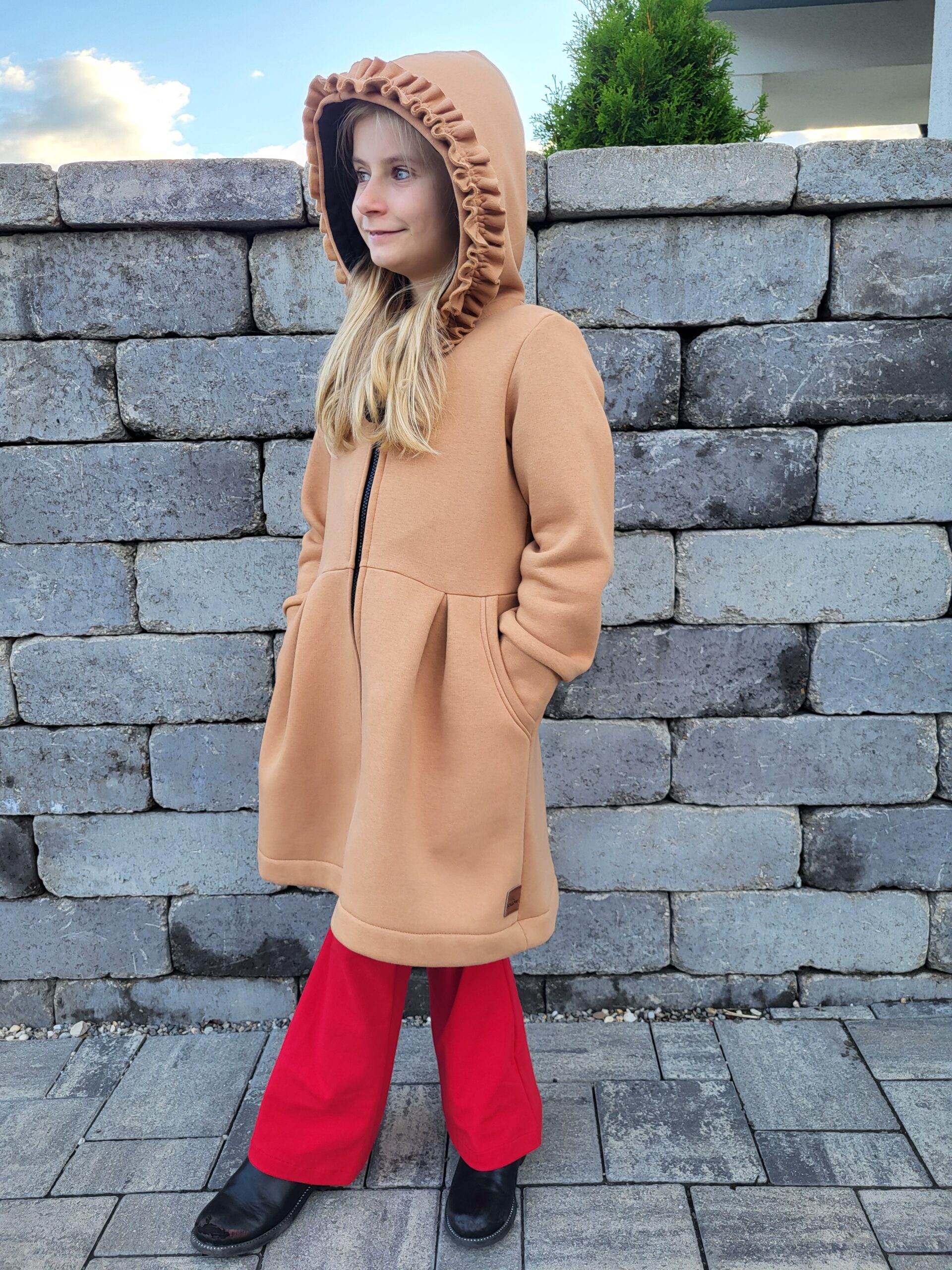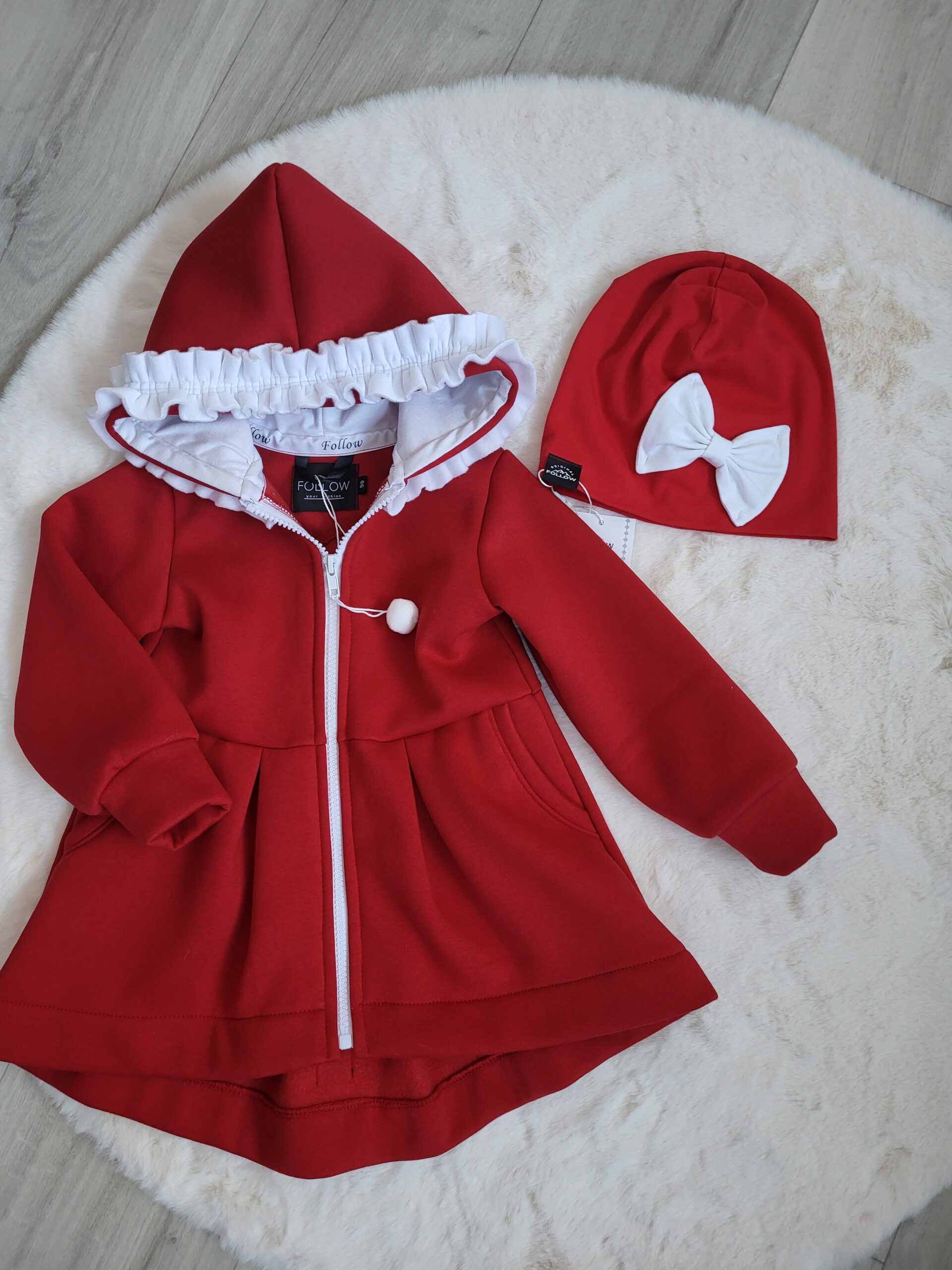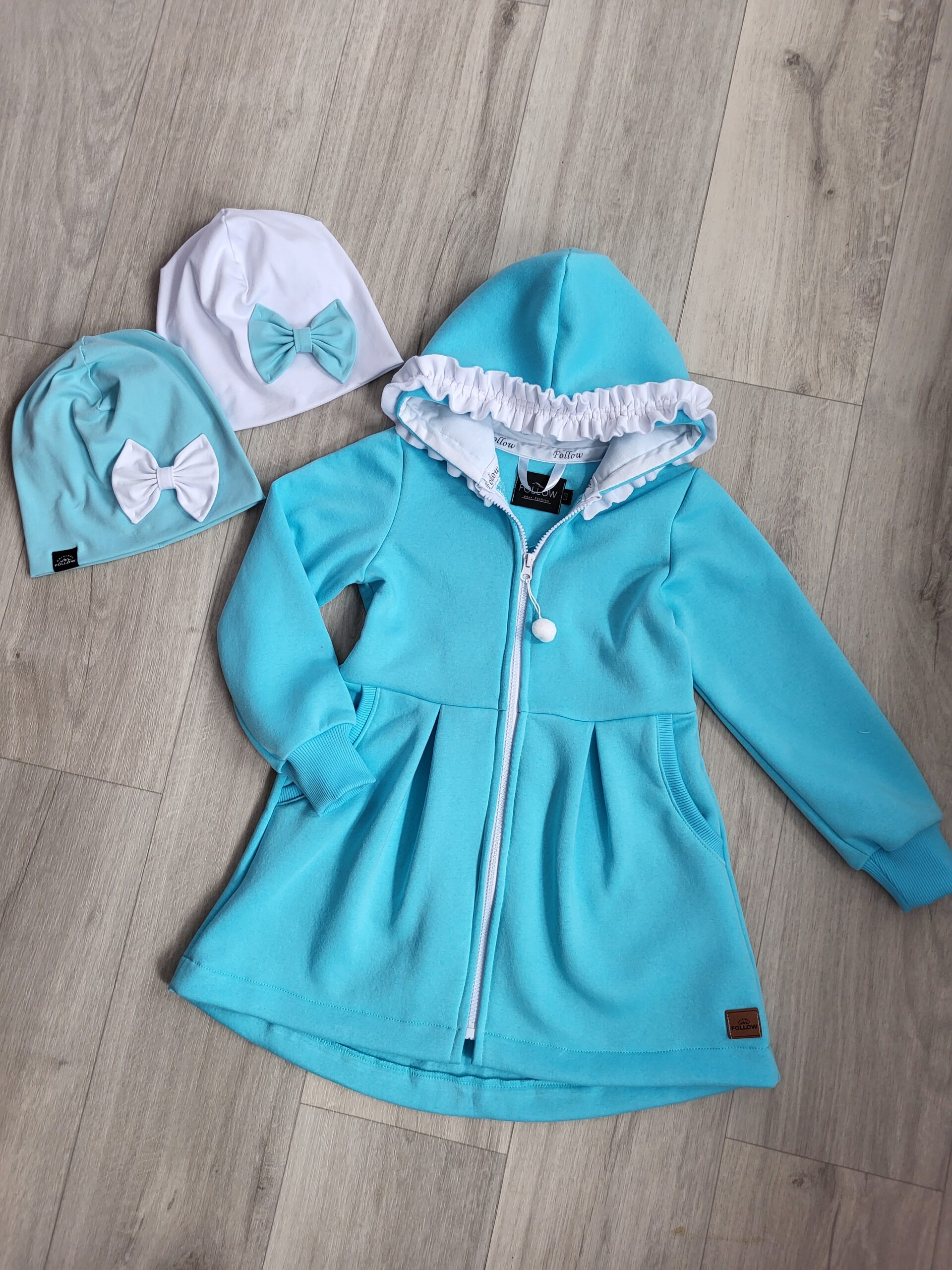 Kabátik je elegantný, predlženého strihu s vreckami, prestrihnutý v páse so záhybmi a s kapucňou. Rukávy sú ukončené manžetou. Je ozdobený riasenkou a mašľou. Zapínanie je na zips. Perfektne sedí, je pohodlný. Ku kabátiku si môžete doladiť legíny/tepláky , čiapku