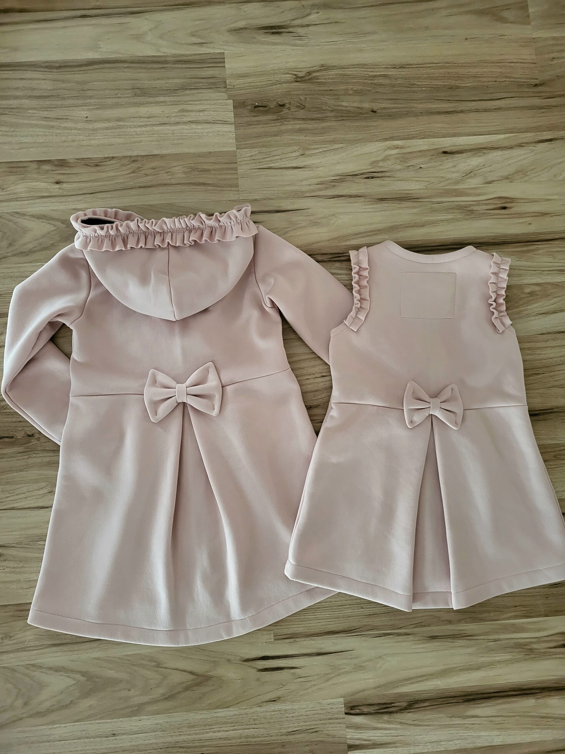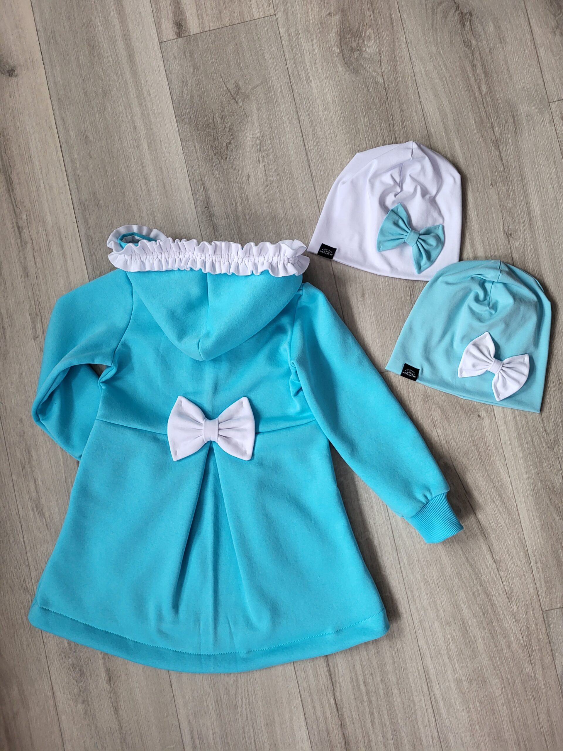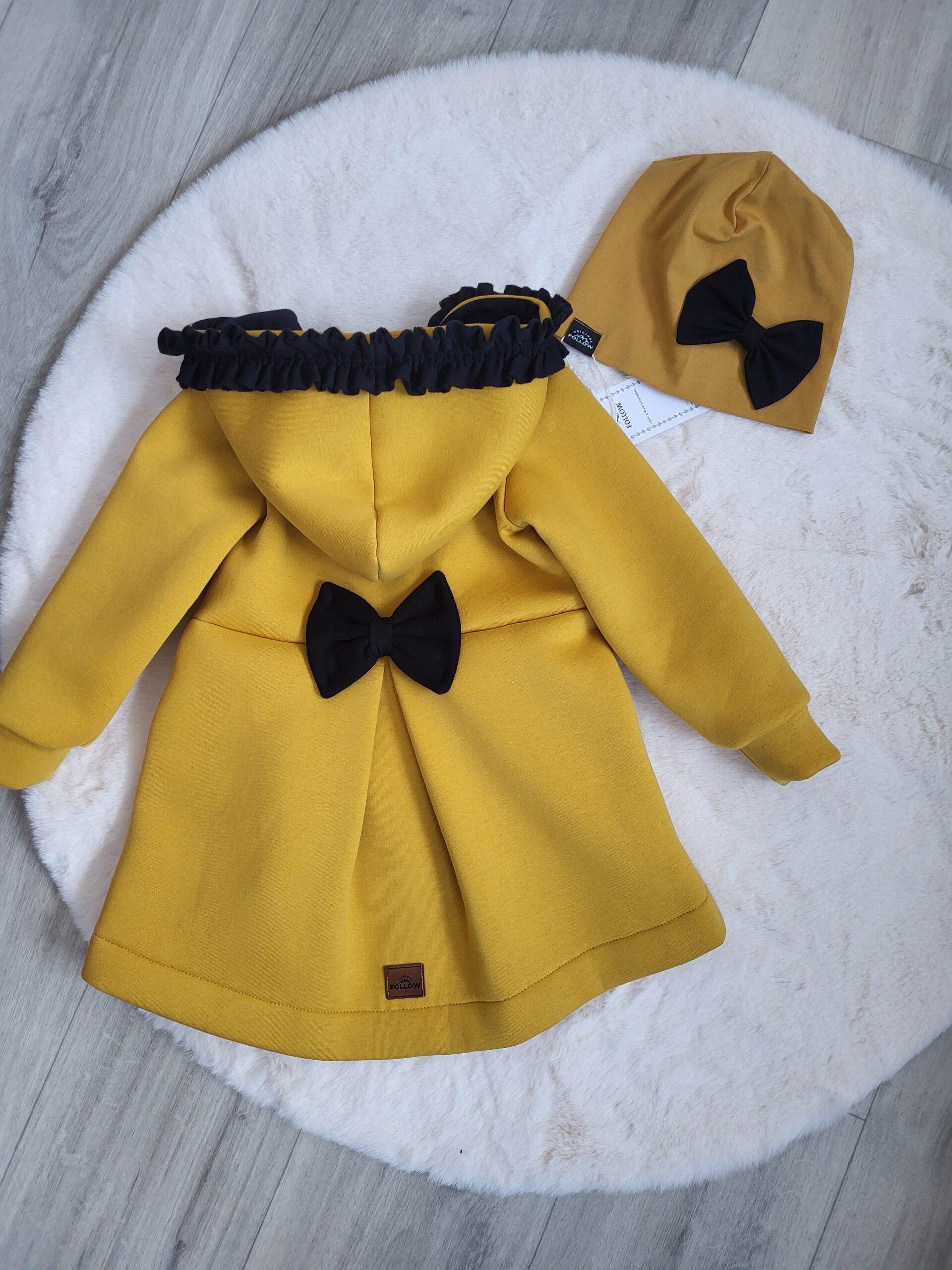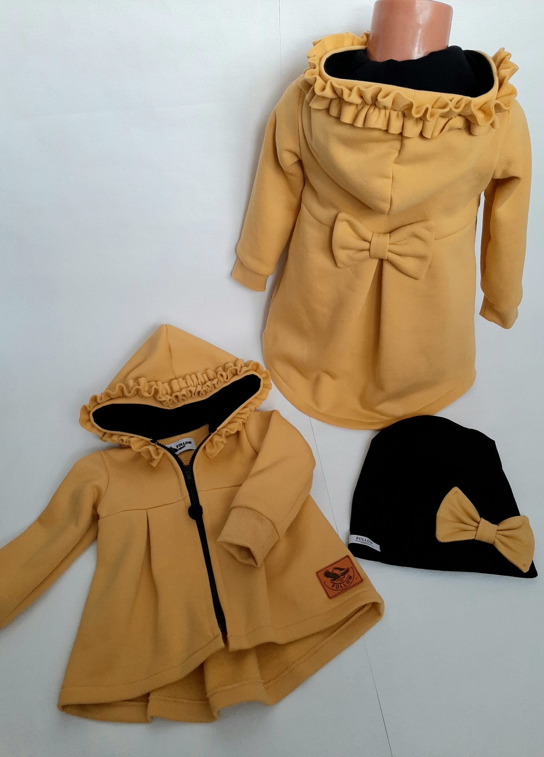 Kabátik je elegantný, predlženého strihu s vreckami, prestrihnutý v páse so záhybmi a s kapucňou. Rukávy sú ukončené manžetou. Je ozdobený riasenkou a mašľou. Zapínanie je na zips. Perfektne sedí, je pohodlný. Ku kabátiku si môžete doladiť legíny/tepláky , čiapku