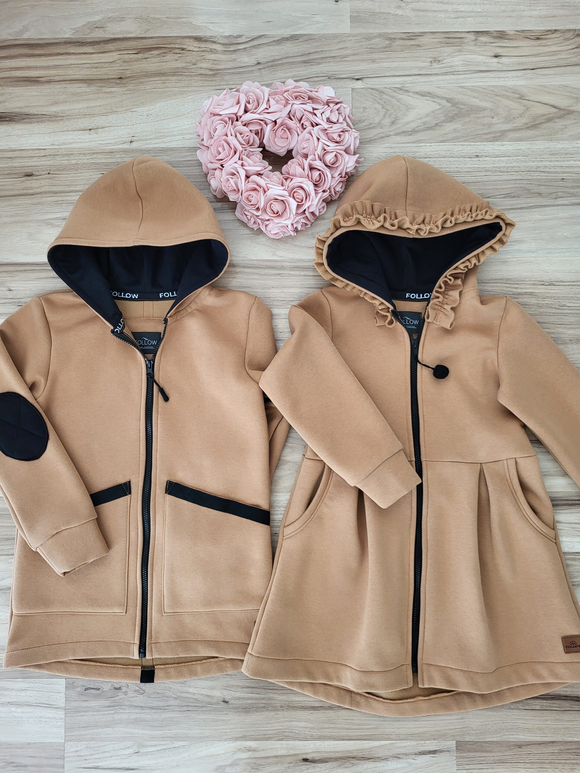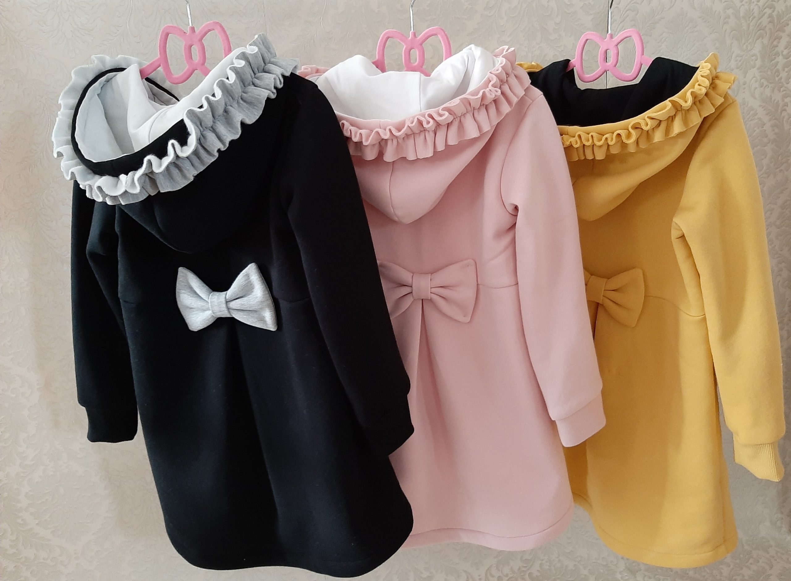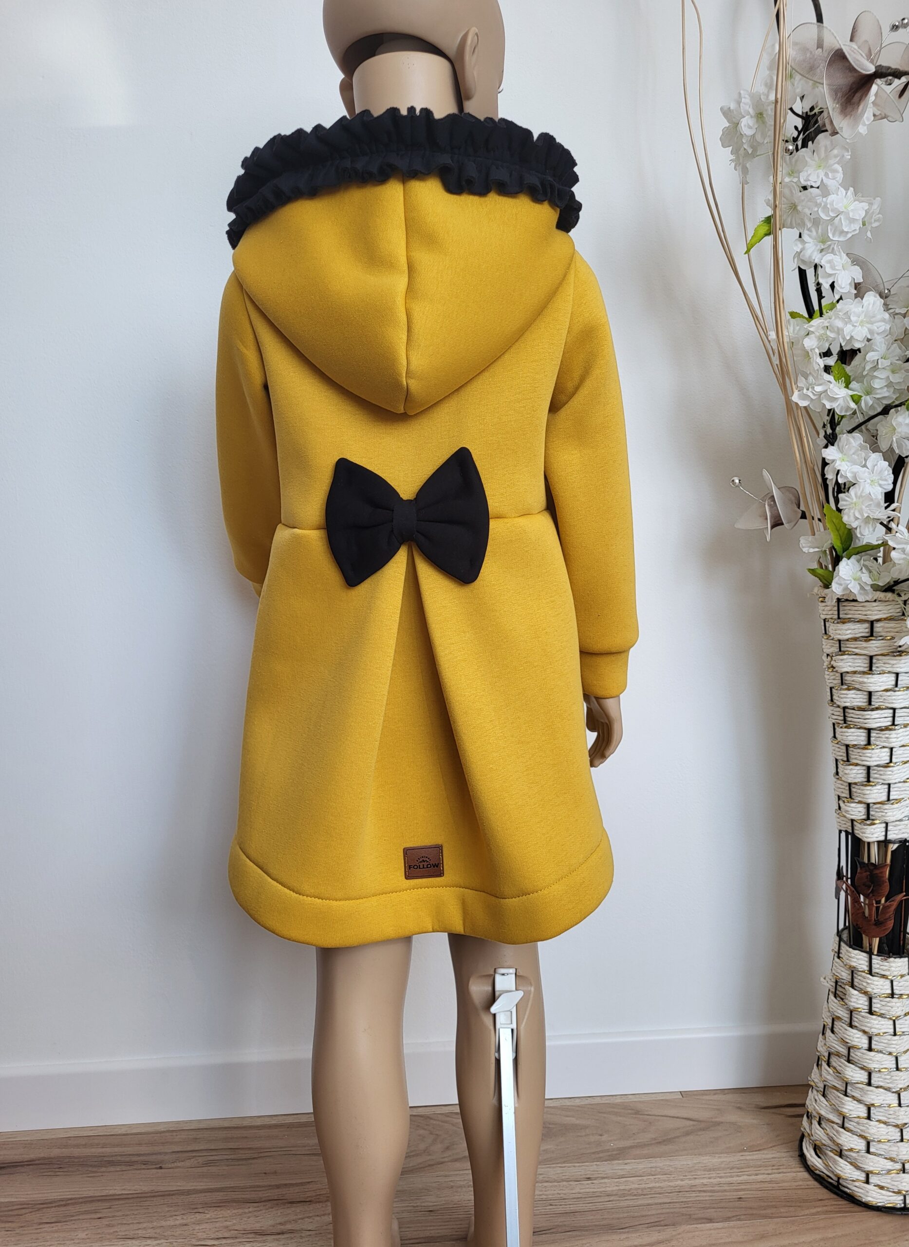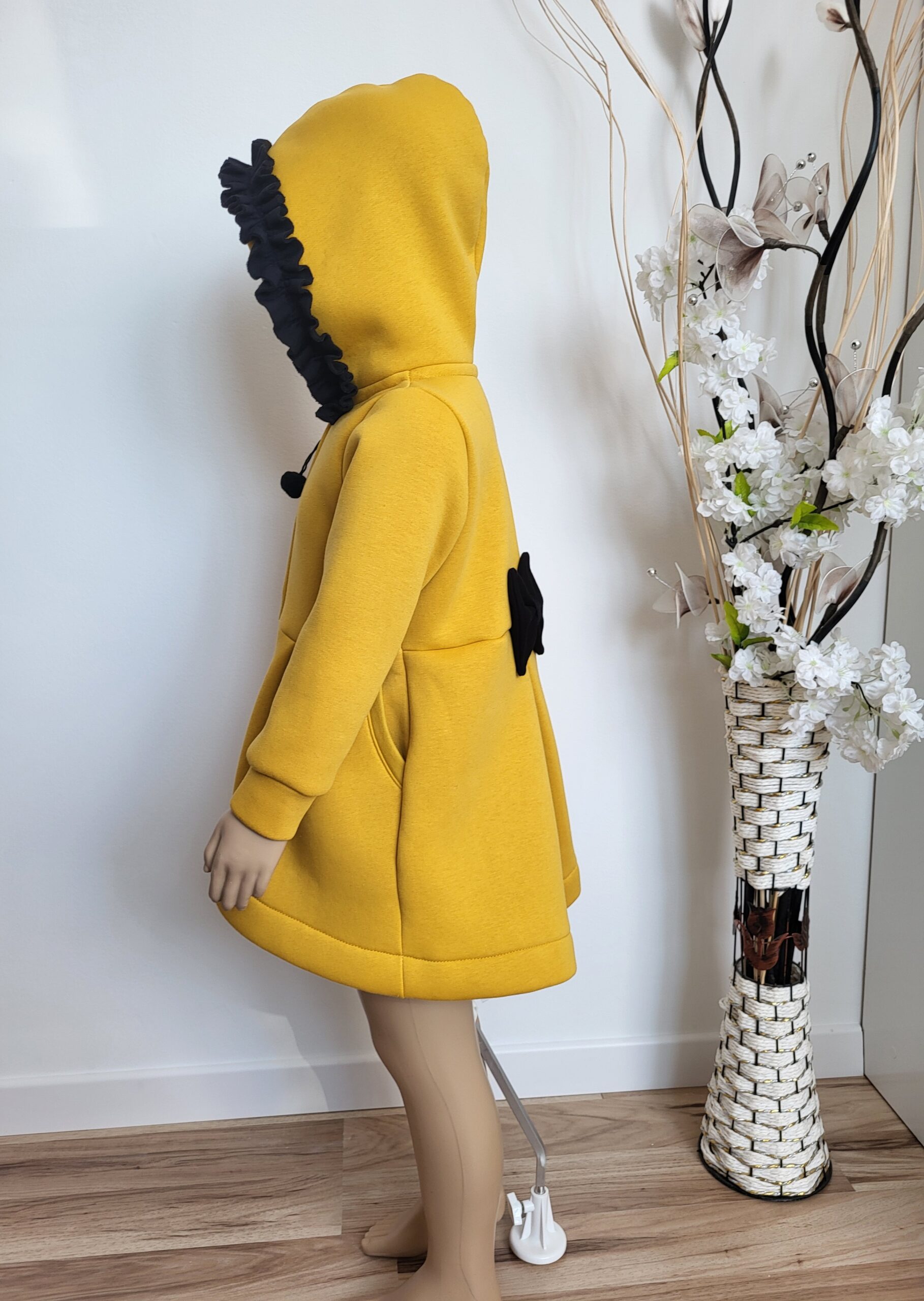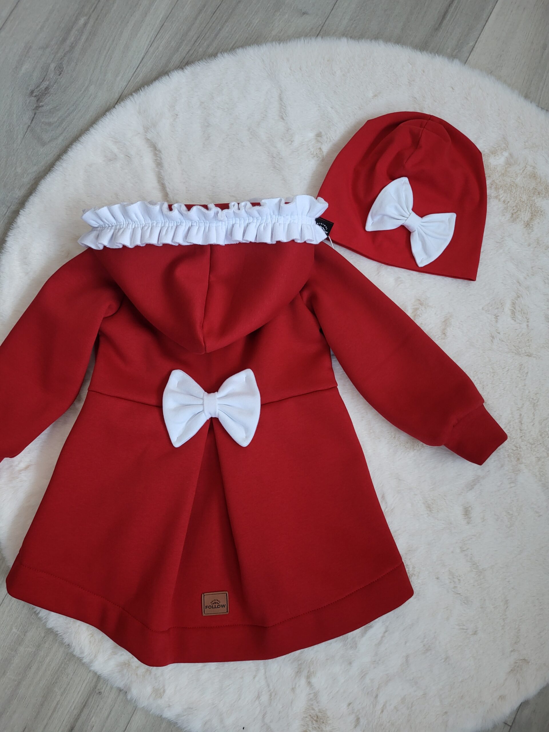Kabátik je elegantný, predlženého strihu s vreckami, prestrihnutý v páse so záhybmi a s kapucňou. Rukávy sú ukončené manžetou. Je ozdobený riasenkou a mašľou. Zapínanie je na zips. Perfektne sedí, je pohodlný. Ku kabátiku si môžete doladiť legíny/tepláky , čiapku