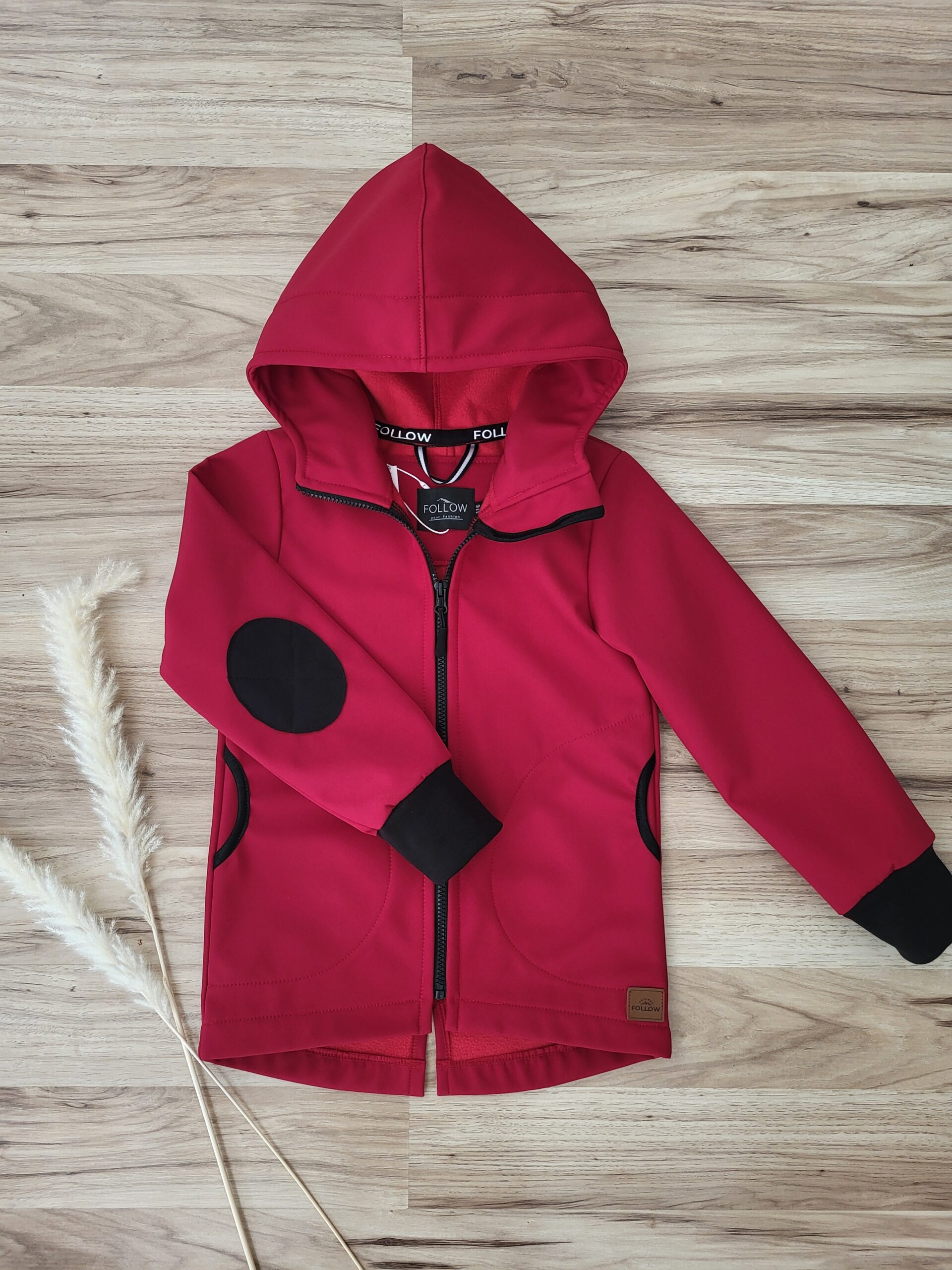 Štýlová funkčná softshellová bunda ušitá zo zimného softshellu je predĺženého strihu s kapucňou, vreckami a ozdobnými záplatami. Rukávy sú ukončené s riasením do gumičky. Vnútorná časť je z fleecu. Perfektne sedí, je pohodlná. Šnúrka v kapucni je voliteľná iba od veľkosti 140.