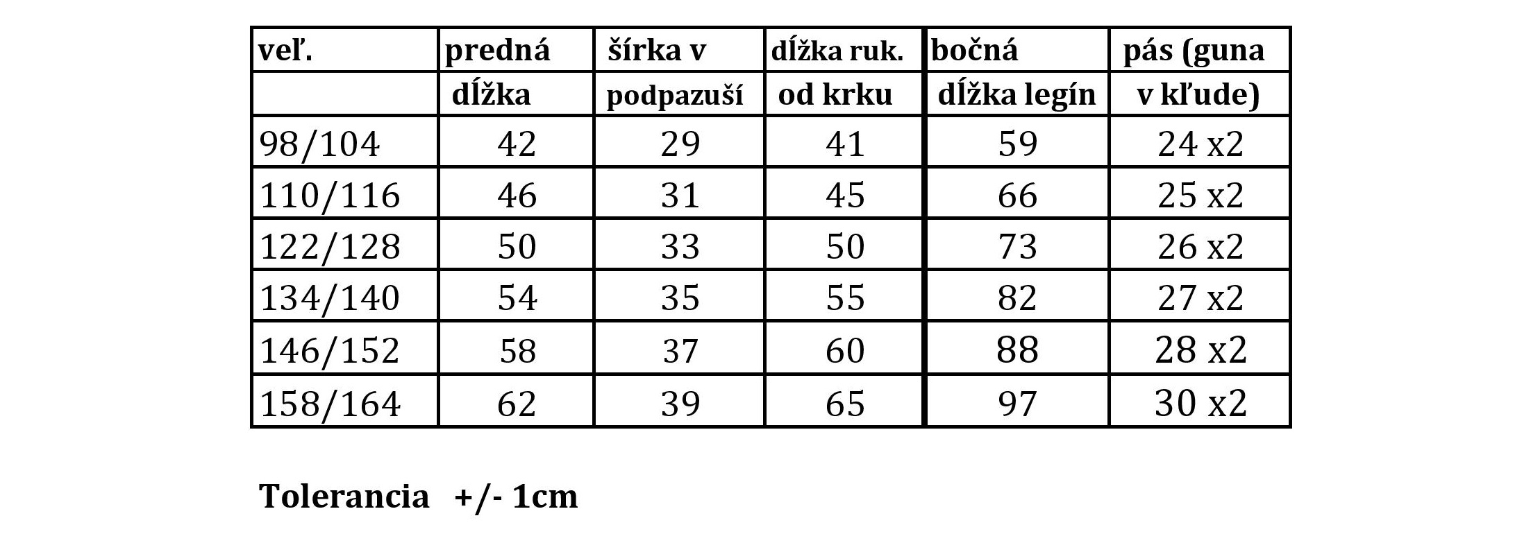 VEĽKOSTNÁ TABUĽKA: