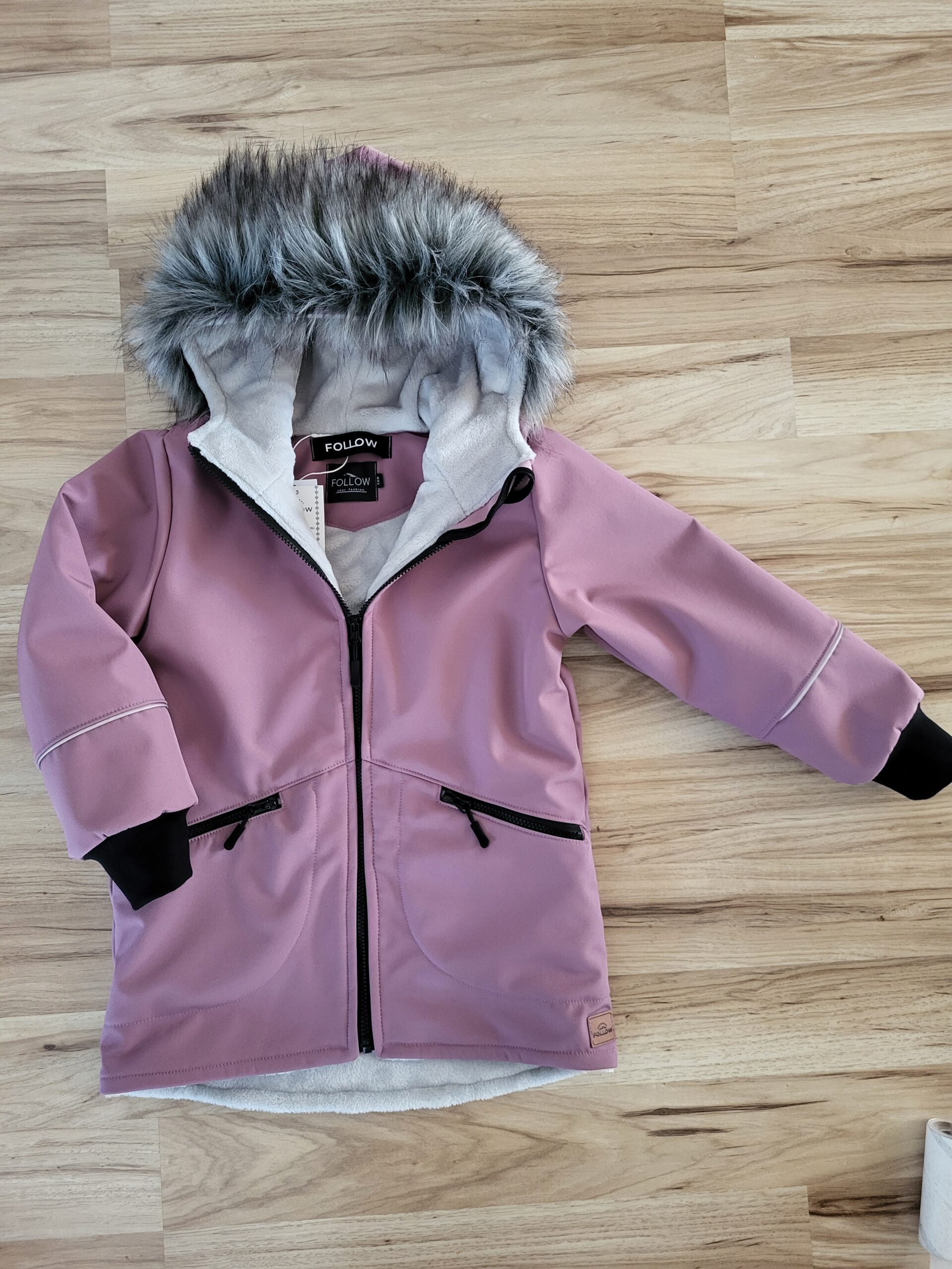 Štýlová softshellová zimná bunda je ušitá zo zimného softshellu a celá podšitá hrubým cosy fleecom. Je predĺženého strihu s kapucňou, vreckami na zips, zdobená reflexným pásikom. Rukávy sú ukončené patentom. Perfektne sedí, je teplá a pohodlná. Kožušina na kapucni je voliteľná a odopínateľná.