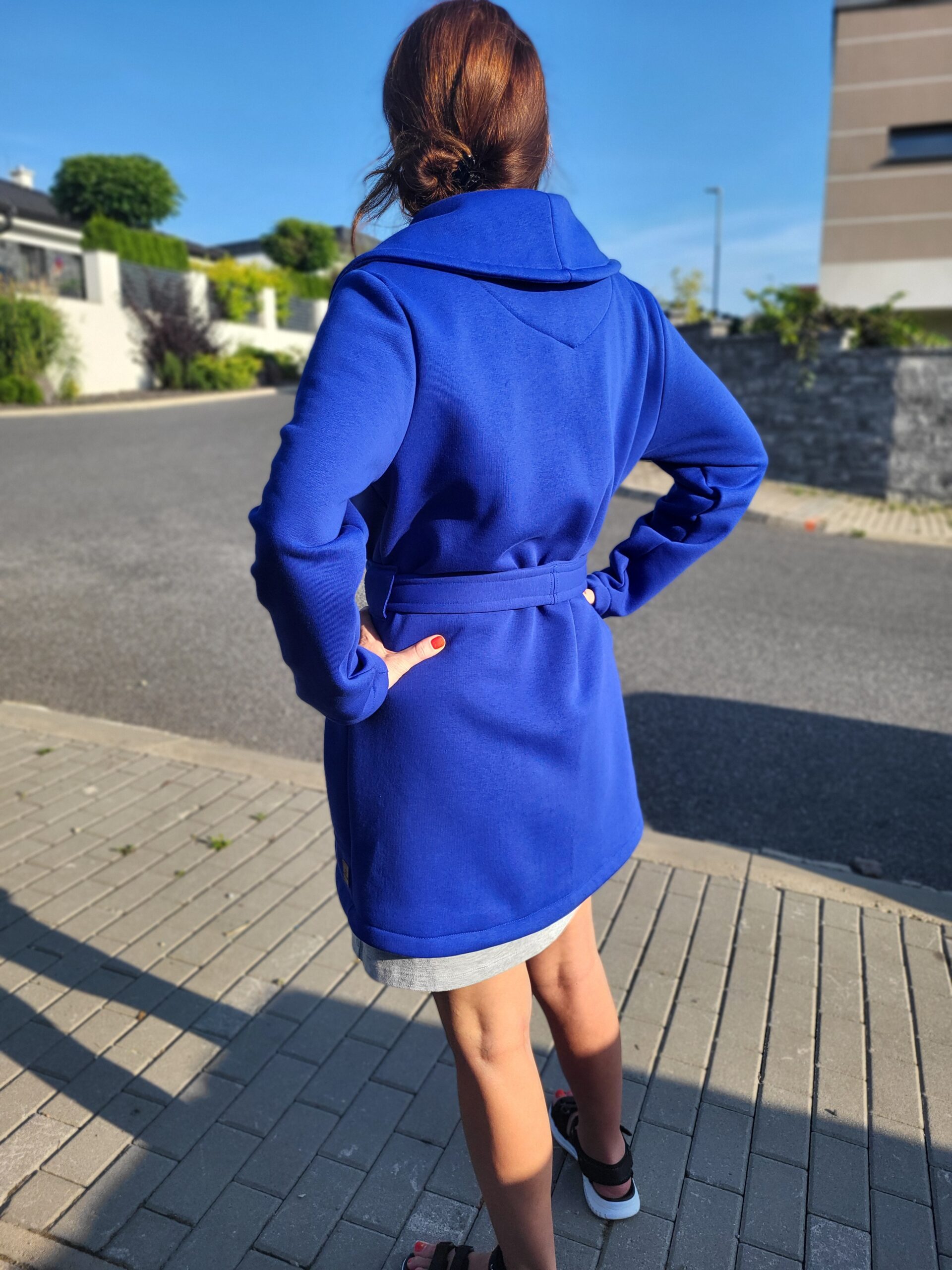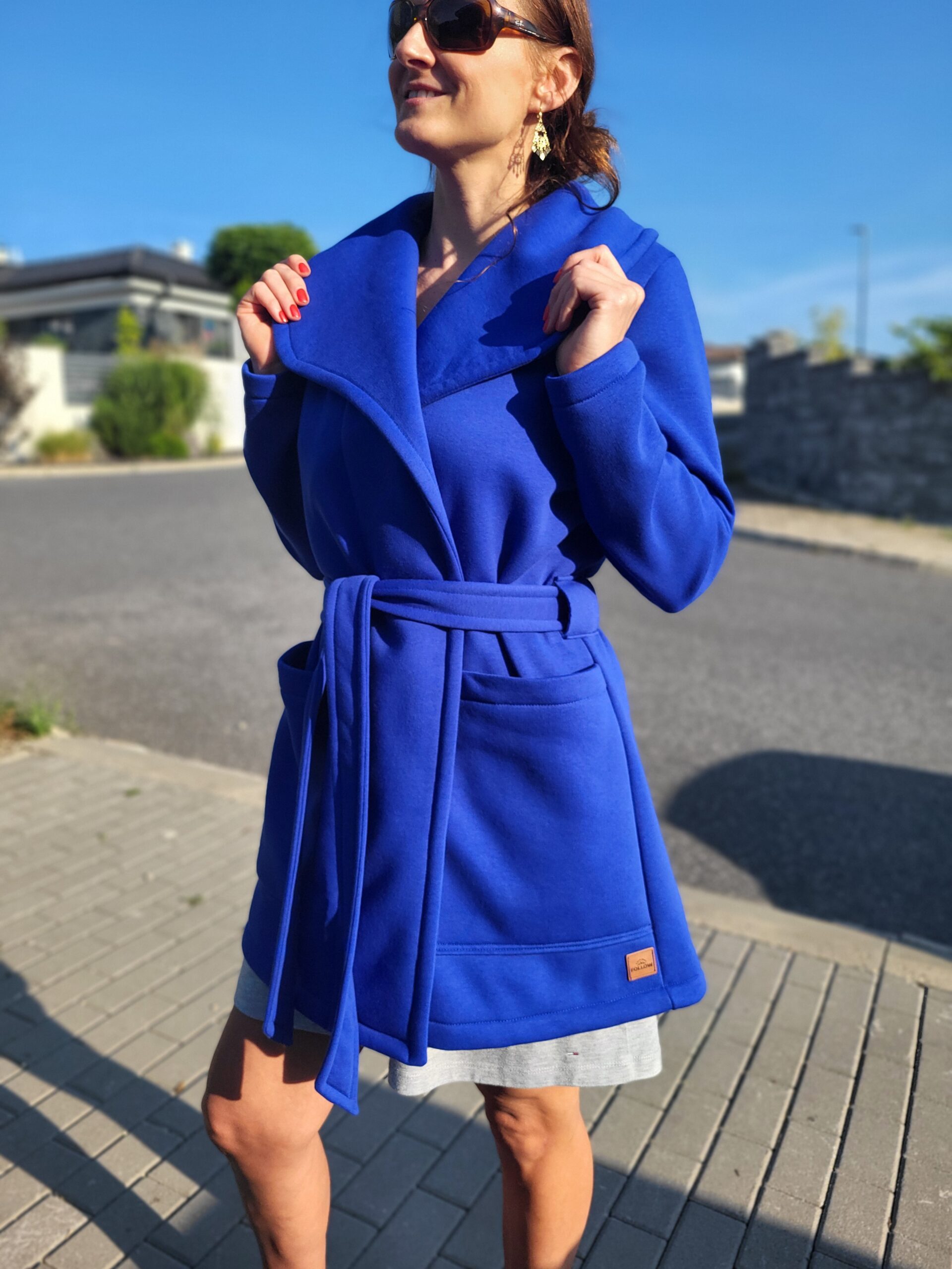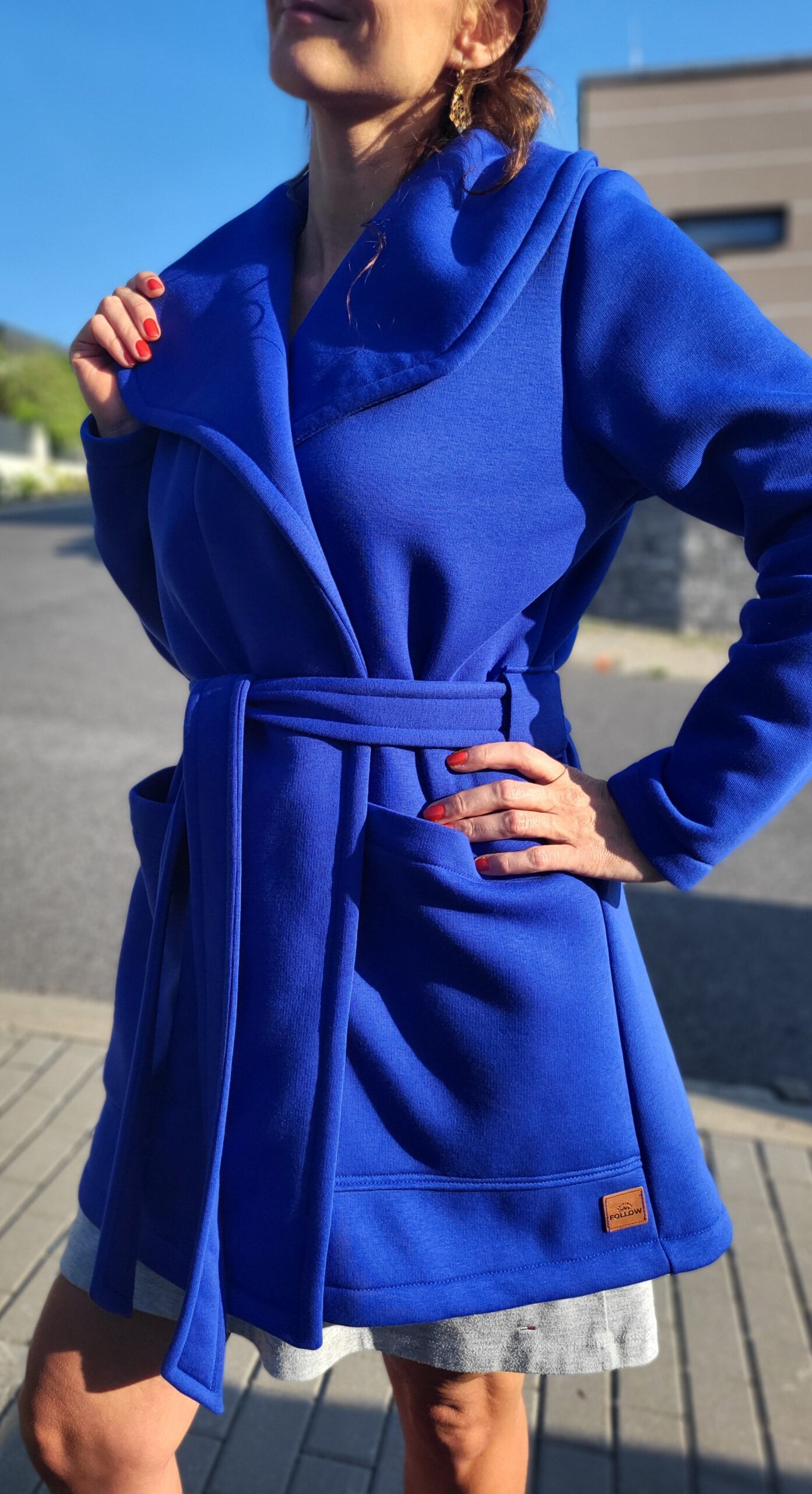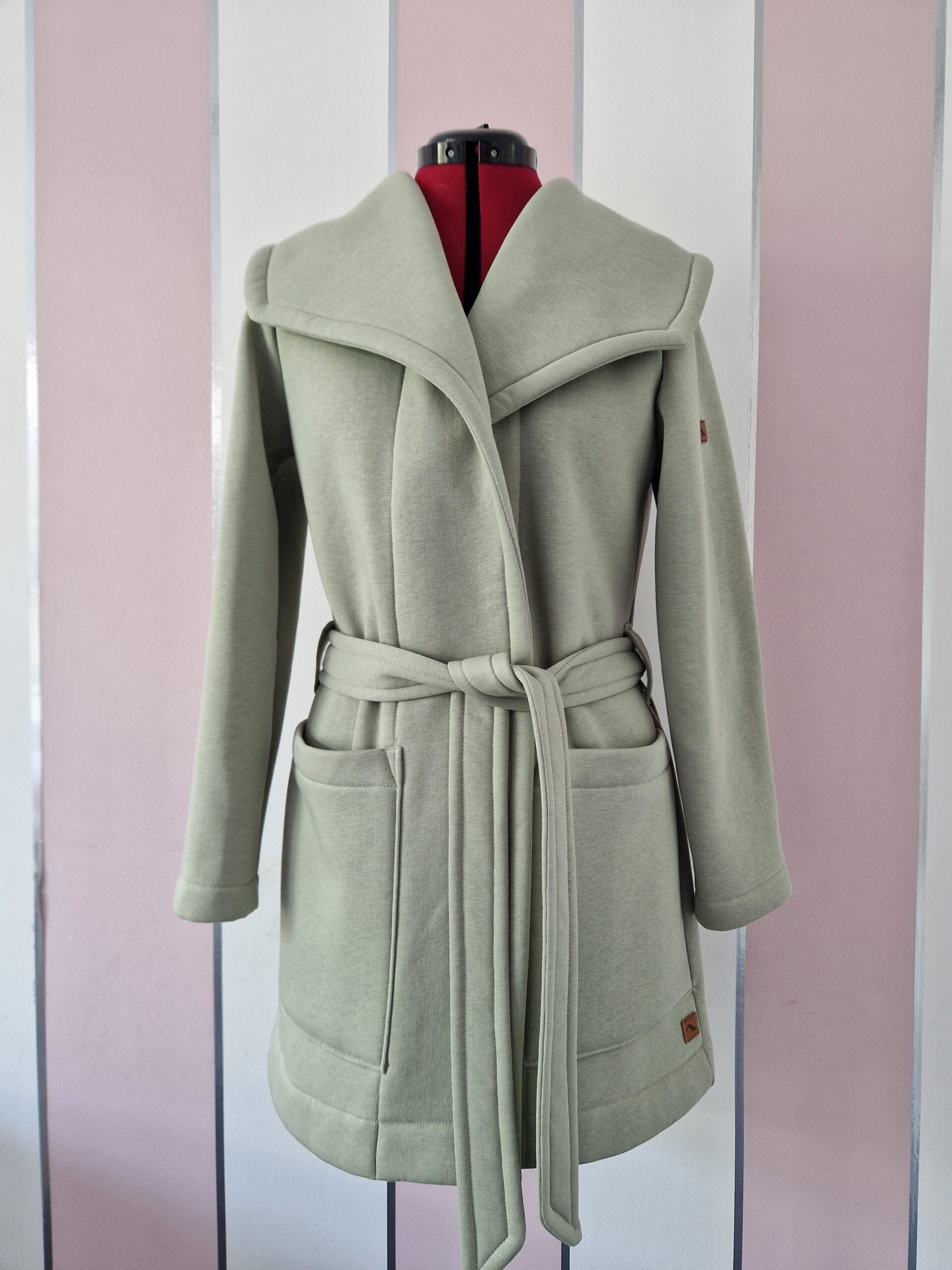 Je áčkového strihu s výraznou fazónou a veľkými vreckami. Zaväzovanie je na opasok. Perfektné sedí a je pohodlný.