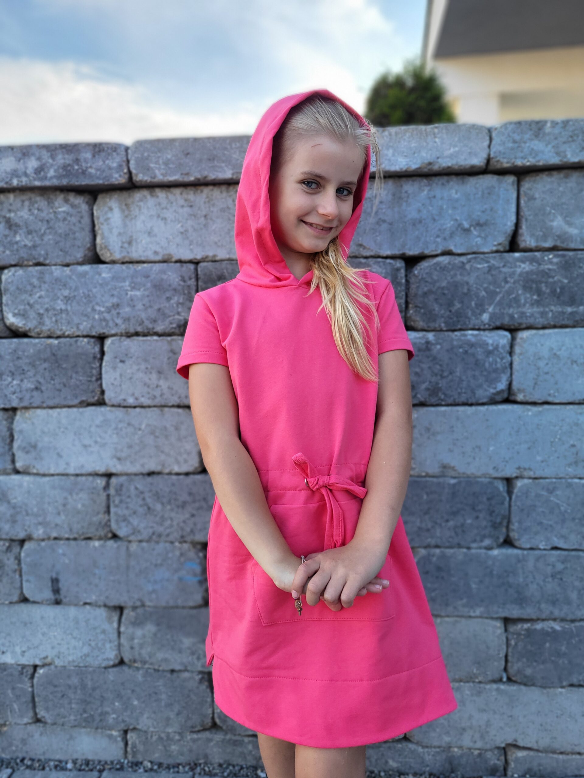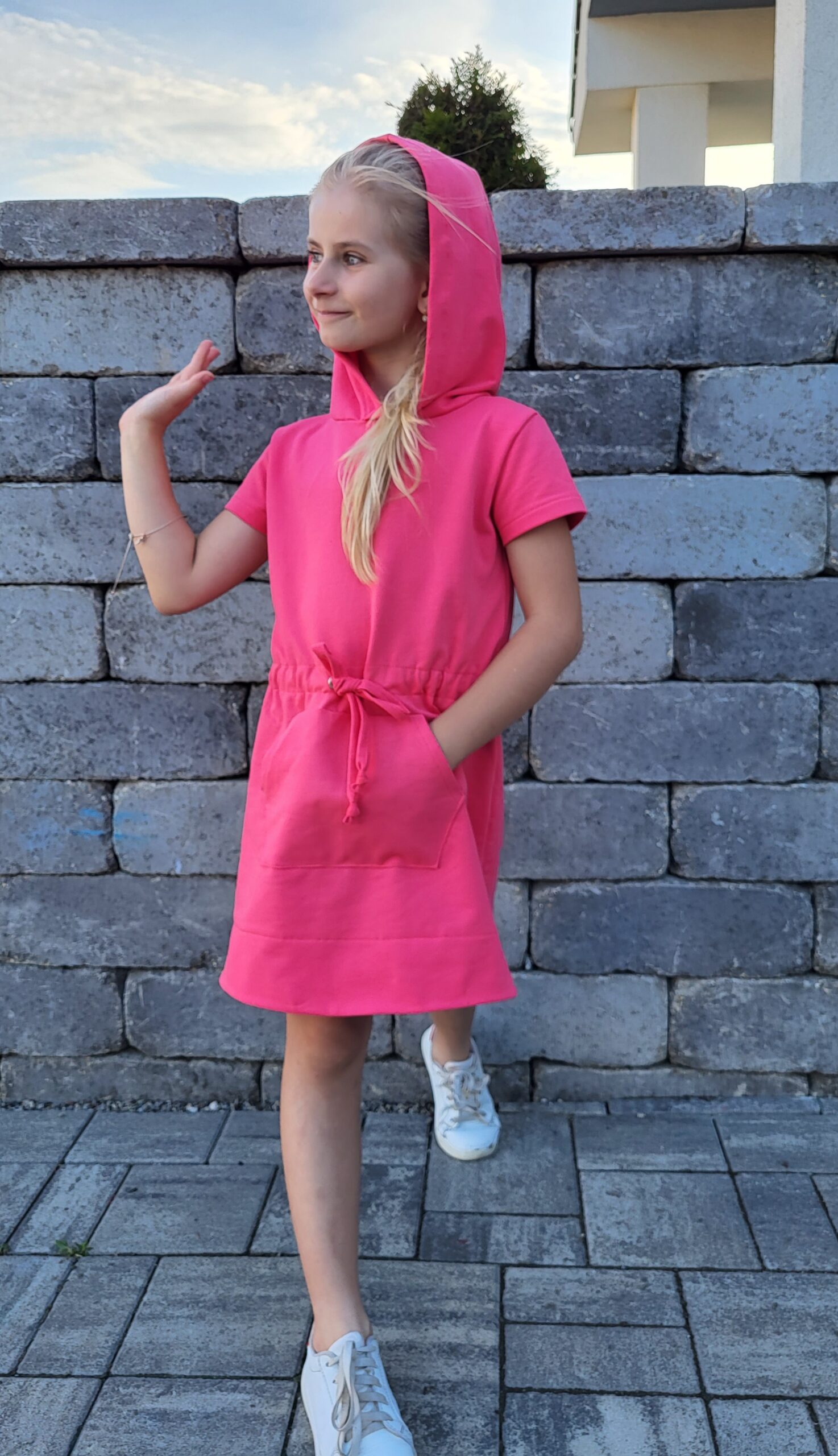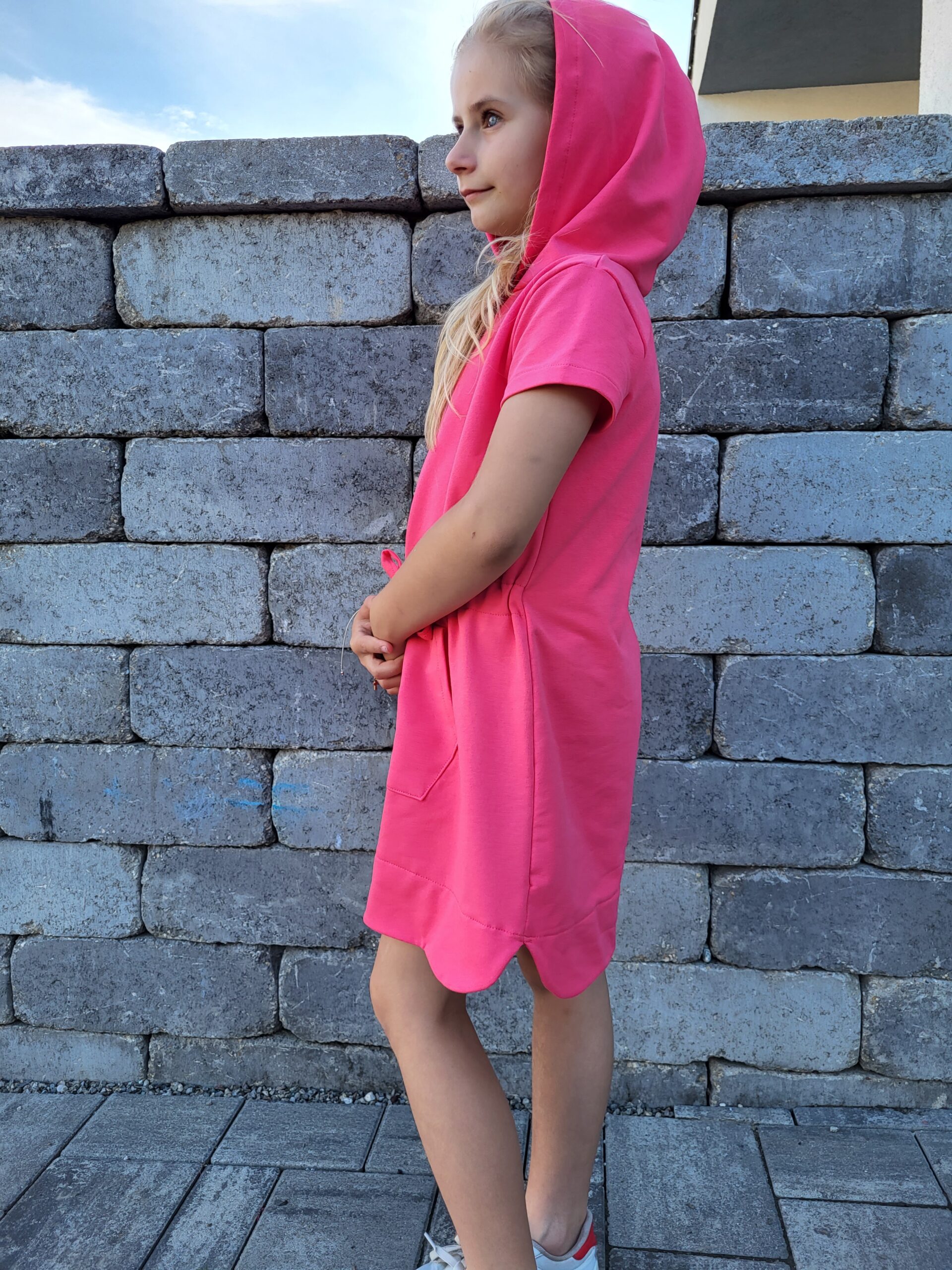Bavlnené mikinové šaty sú ušité z príjemnej elastickej teplákoviny. V prednej časti je klokanie vrecko, v páse je vložená šnúrka. Šaty je možné vybrať s kapucňou aj bez kapucne. K šatám si môžete doladiť napríklad legíny, čiapku, čelenky, mikiny