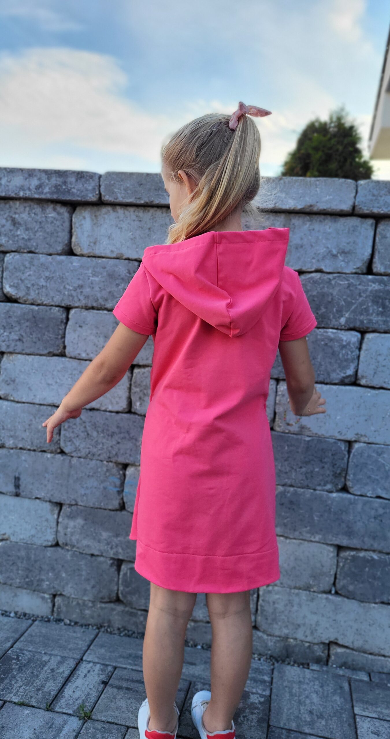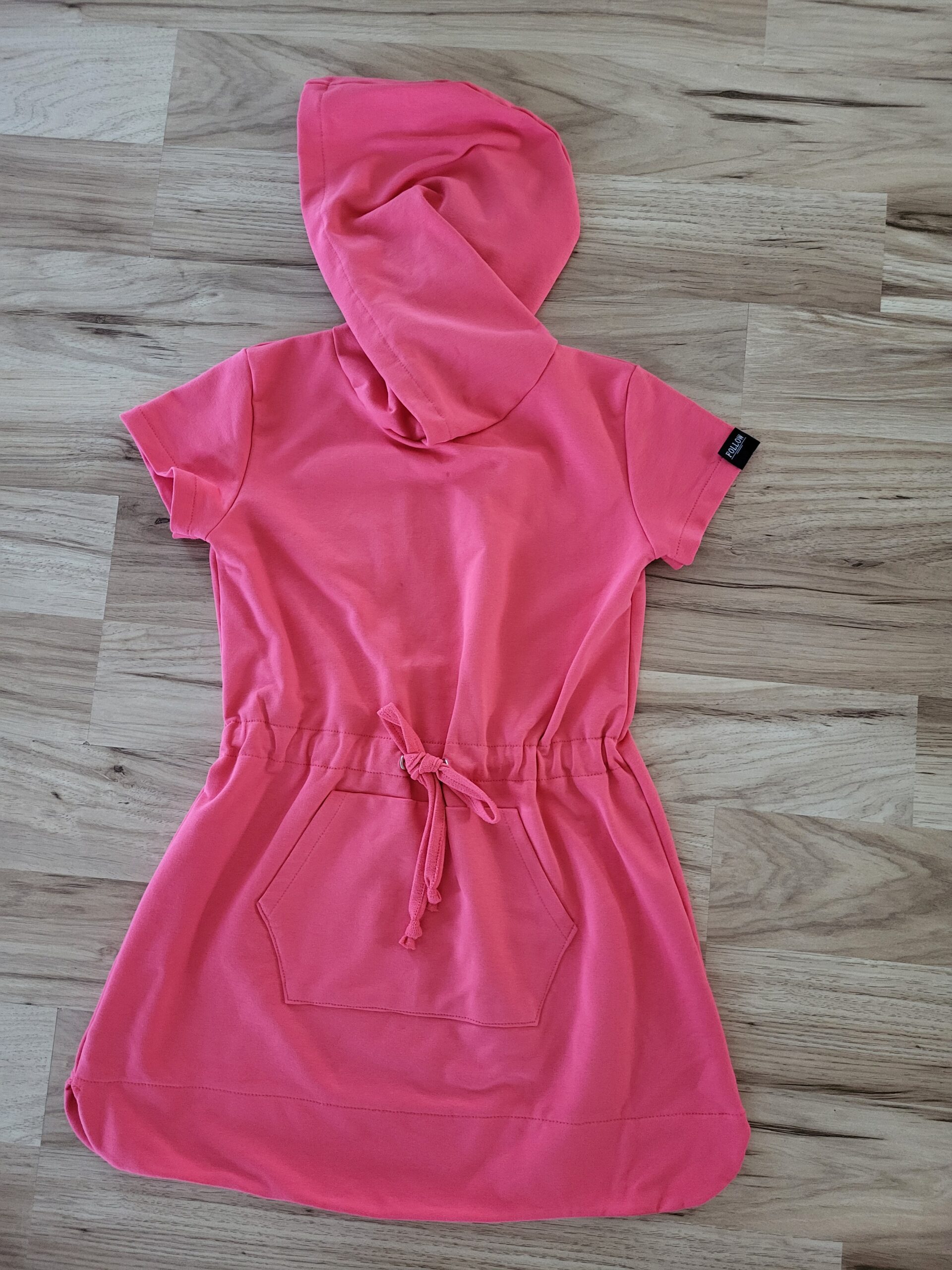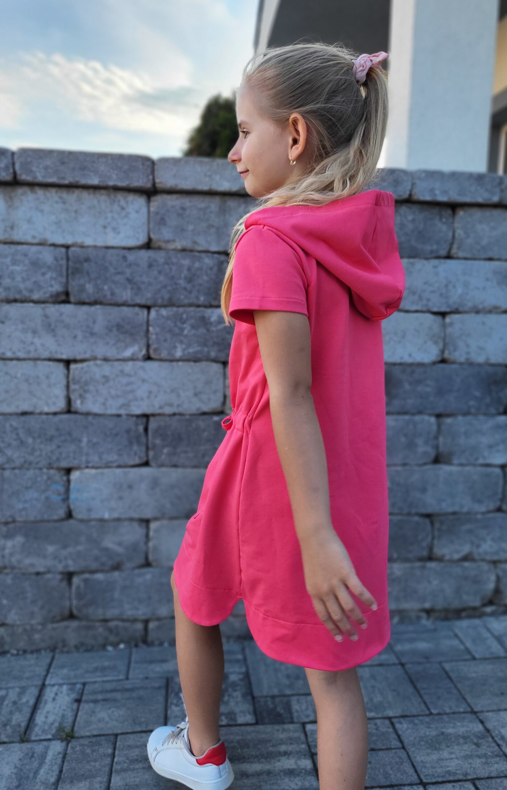 Bavlnené mikinové šaty sú ušité z príjemnej elastickej teplákoviny. V prednej časti je klokanie vrecko, v páse je vložená šnúrka. Šaty je možné vybrať s kapucňou aj bez kapucne. K šatám si môžete doladiť napríklad legíny, čiapku, čelenky, mikiny