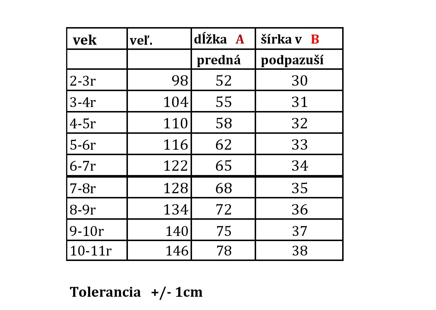 TABUĽKA VEĽKOSTI: