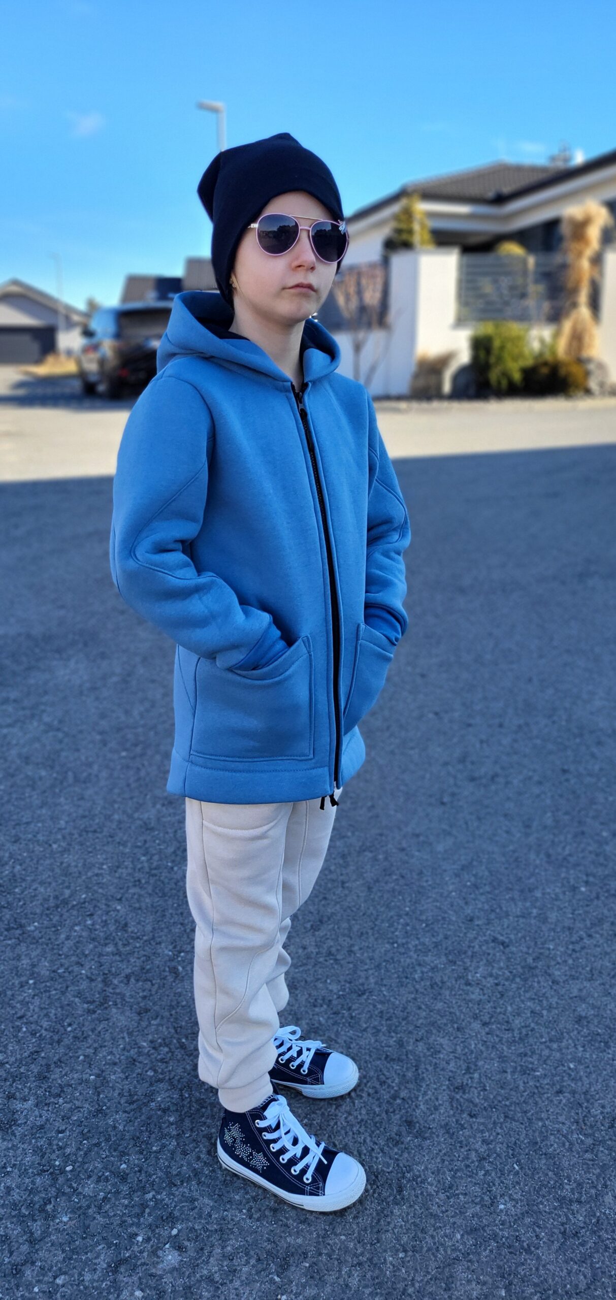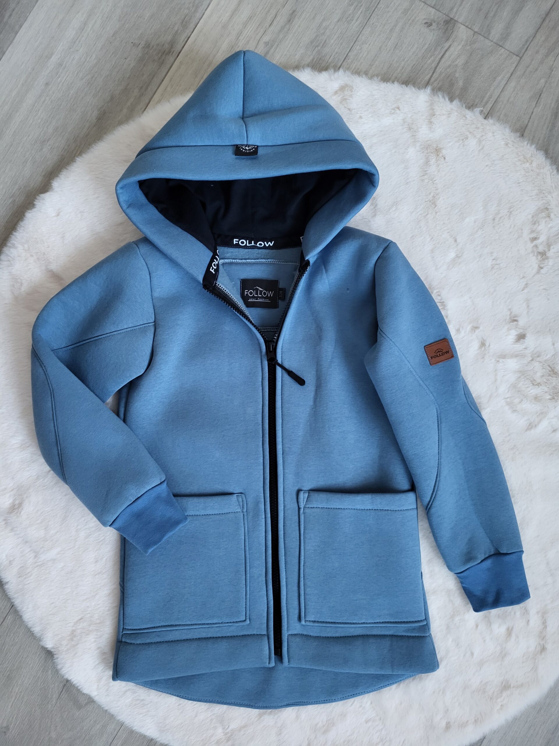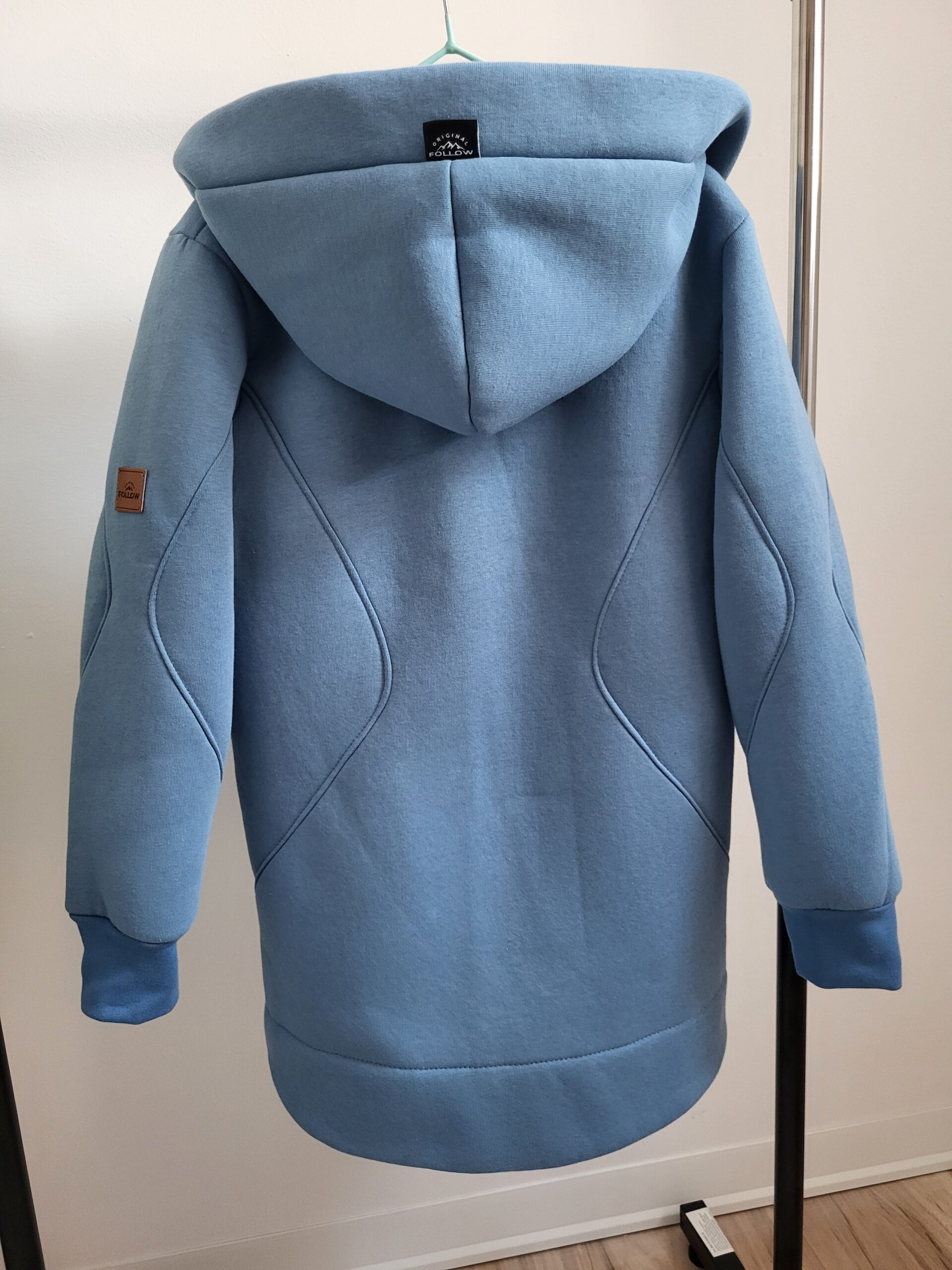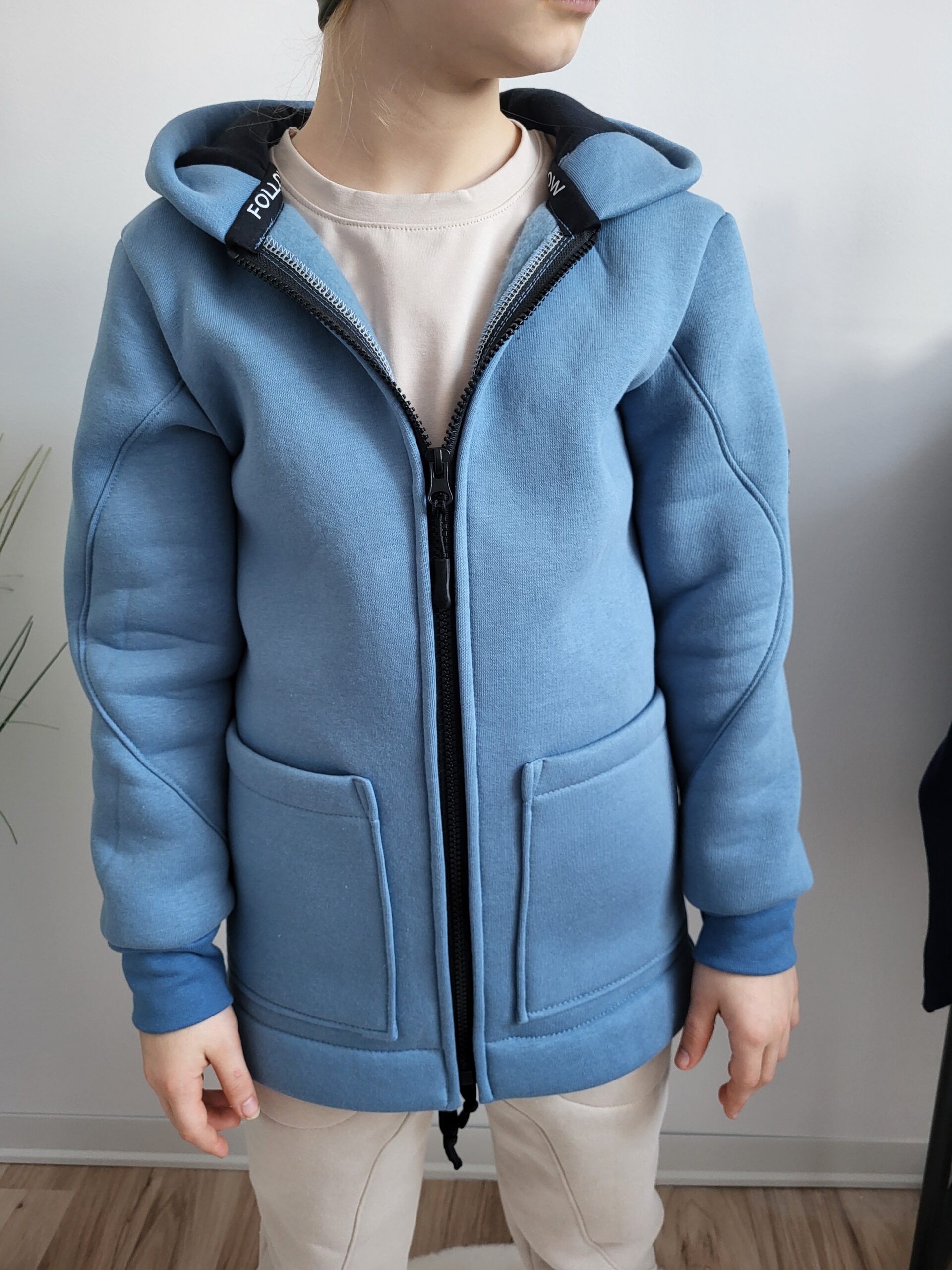 Mikina je predlženého strihu s kapucňou ,vreckami a zapínaním na zips. Rukávy sú ukončené manžetou. Perfektne sedí, je pohodlná.