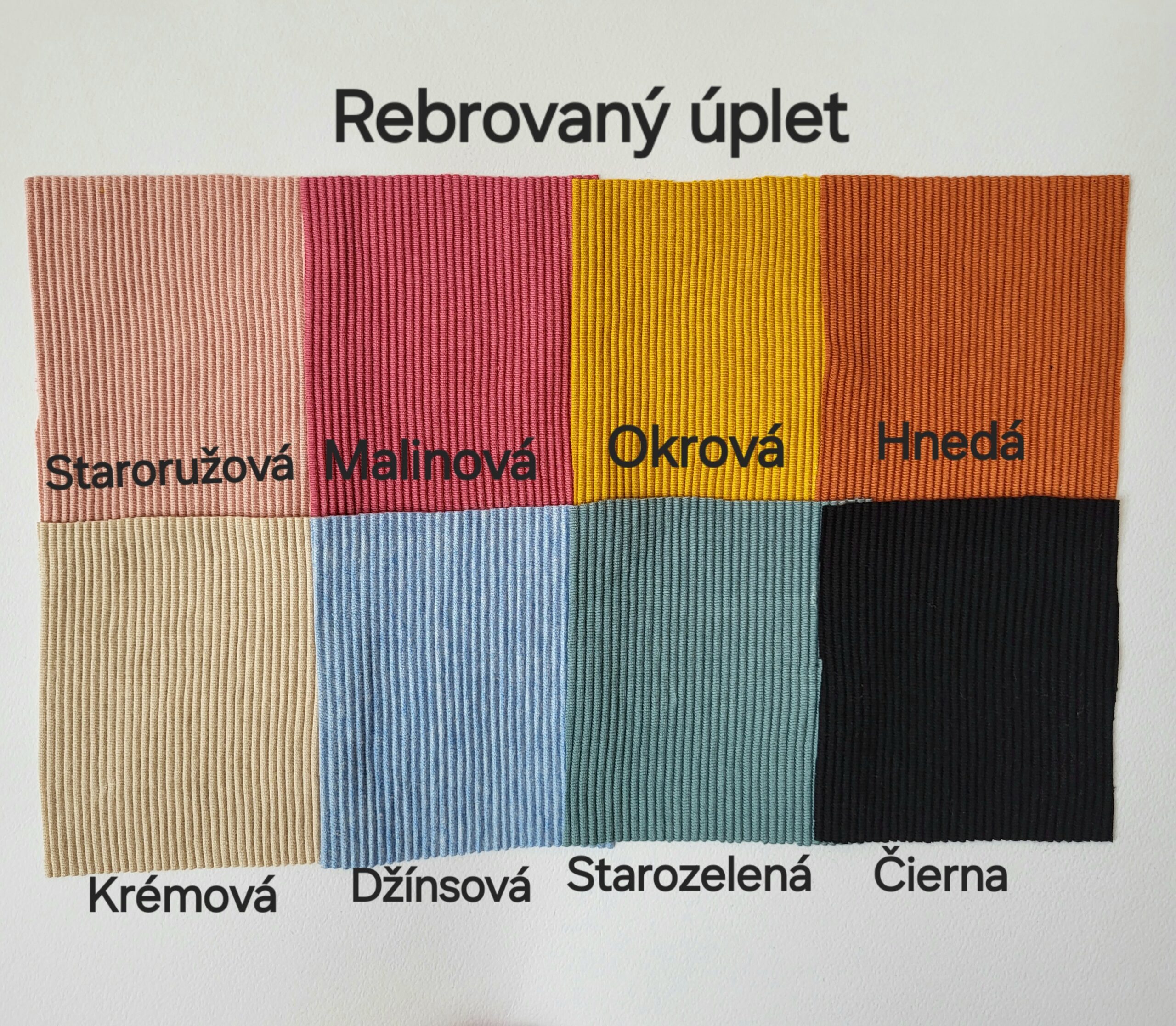 80% bavlna, 15% polyester, 5% elastán. Rebrovaný elastický úplet.