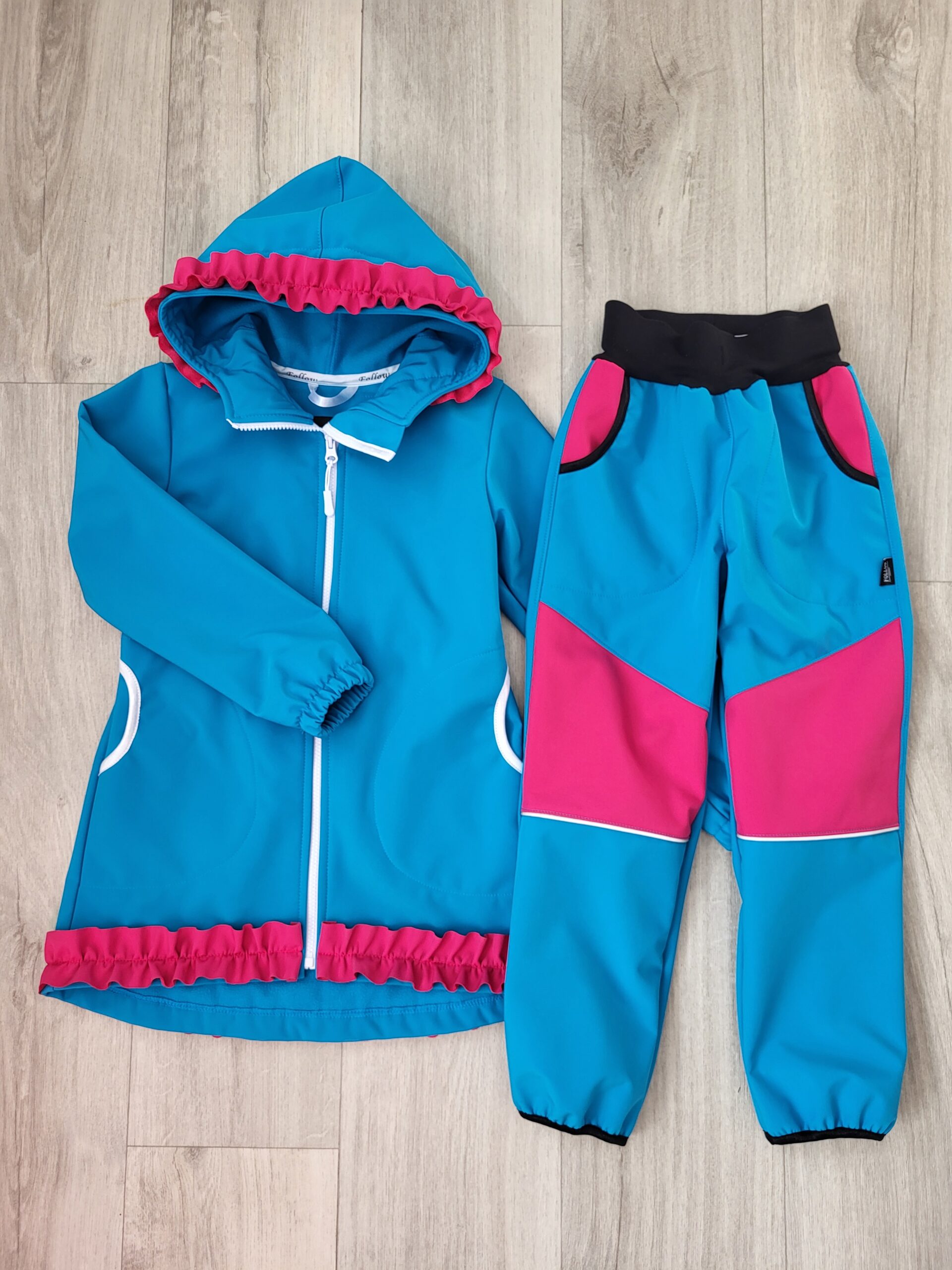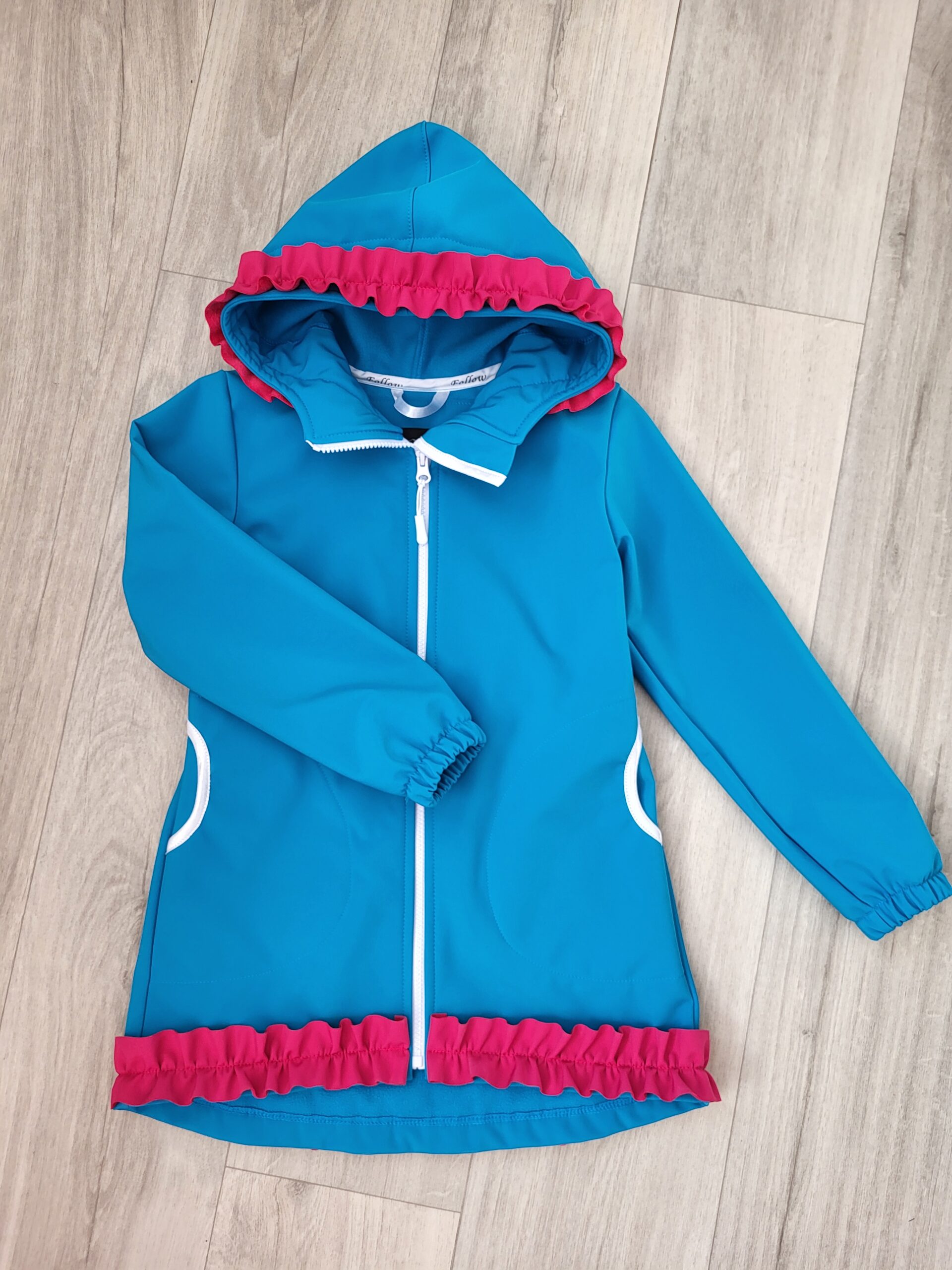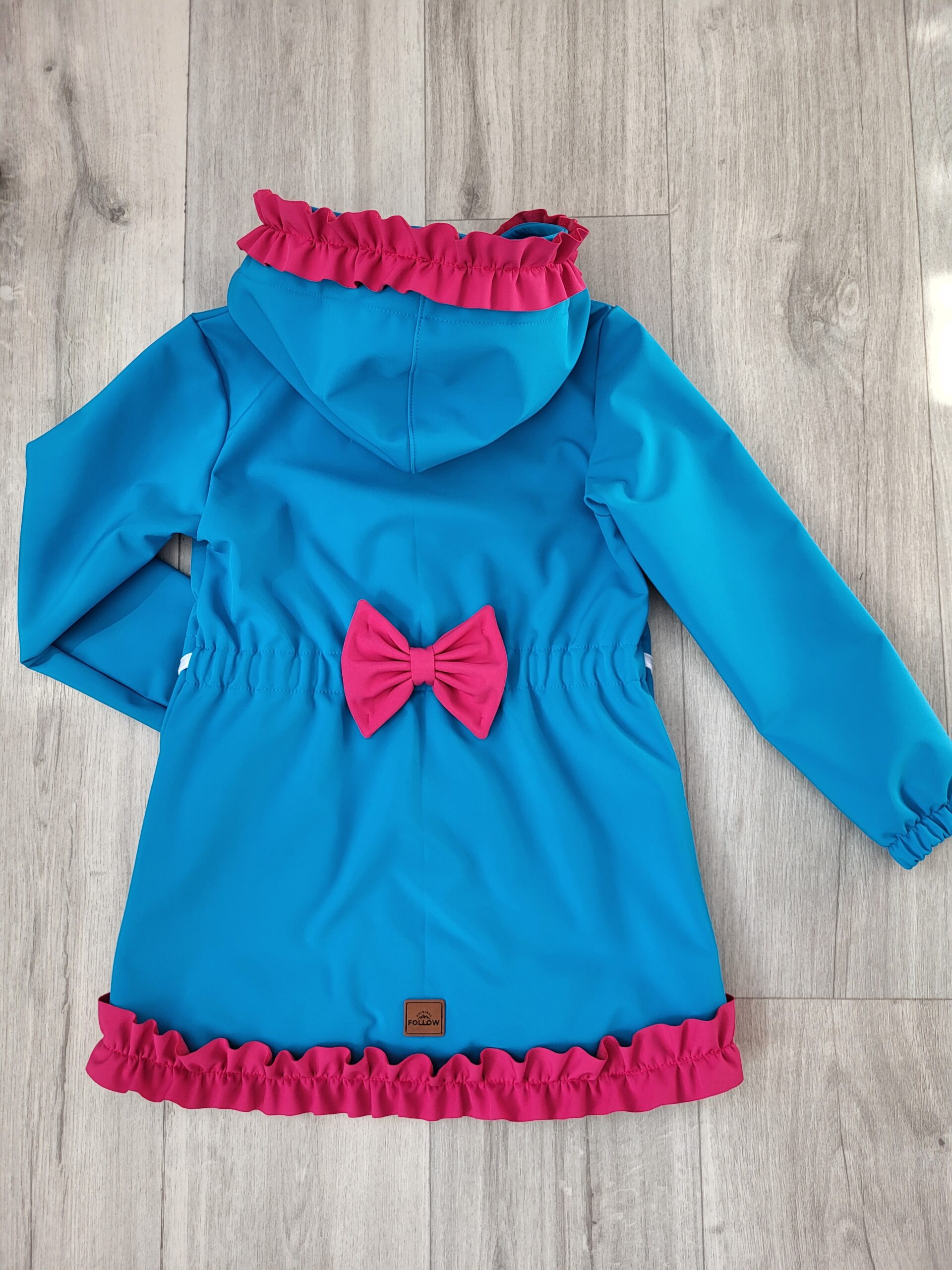 Štýlová softshellová bunda ušitá zo zimného softshelluje . Je predĺženého strihu s kapucňou, vreckami, vzadu stiahnutá gumou. Rukávy sú ukončené s riasením do gumičky. Vnútorná časť je z fleecu. Bunda je ozdobená riasenkami a mašľou. Mašľa je vo farbe riasenky ale ak si prajete inú farbu mašle, prosím napíšte do poznámky v objednávke. Perfektne sedí, je pohodlná. Šnúrka v kapucni je voliteľná iba od veľkosti 140. K bunde si môžete doladiť čiapku , rukavice alebo nohavice