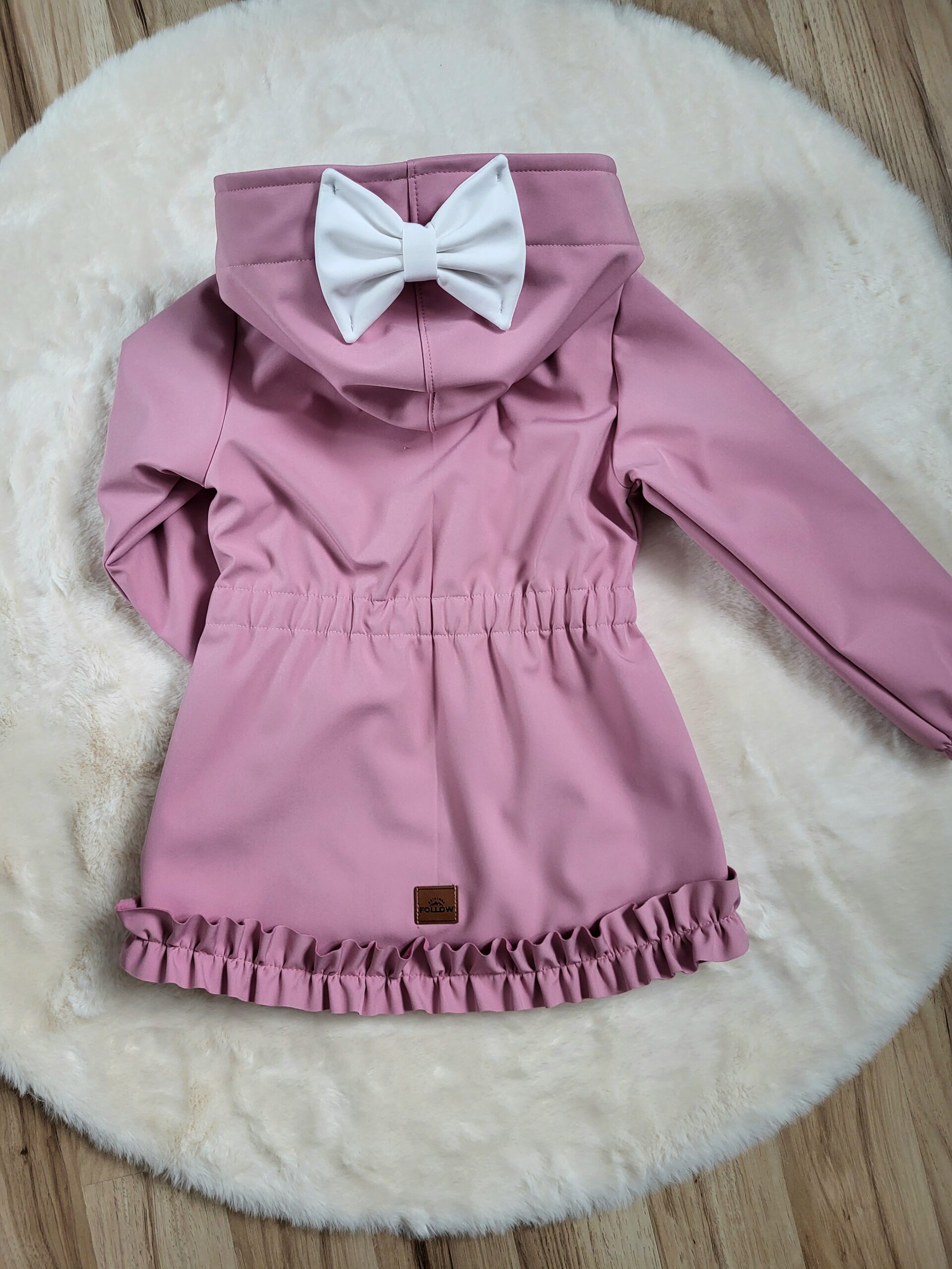 Štýlová softshellová bunda ušitá zo zimného softshelluje . Je predĺženého strihu s kapucňou, vreckami, vzadu stiahnutá gumou. Rukávy sú ukončené s riasením do gumičky. Vnútorná časť je z fleecu. Bunda je ozdobená riasenkami a mašľou. Mašľa je vo farbe riasenky ale ak si prajete inú farbu mašle, prosím napíšte do poznámky v objednávke. Perfektne sedí, je pohodlná. Šnúrka v kapucni je voliteľná iba od veľkosti 140. K bunde si môžete doladiť čiapku , rukavice alebo nohavice
