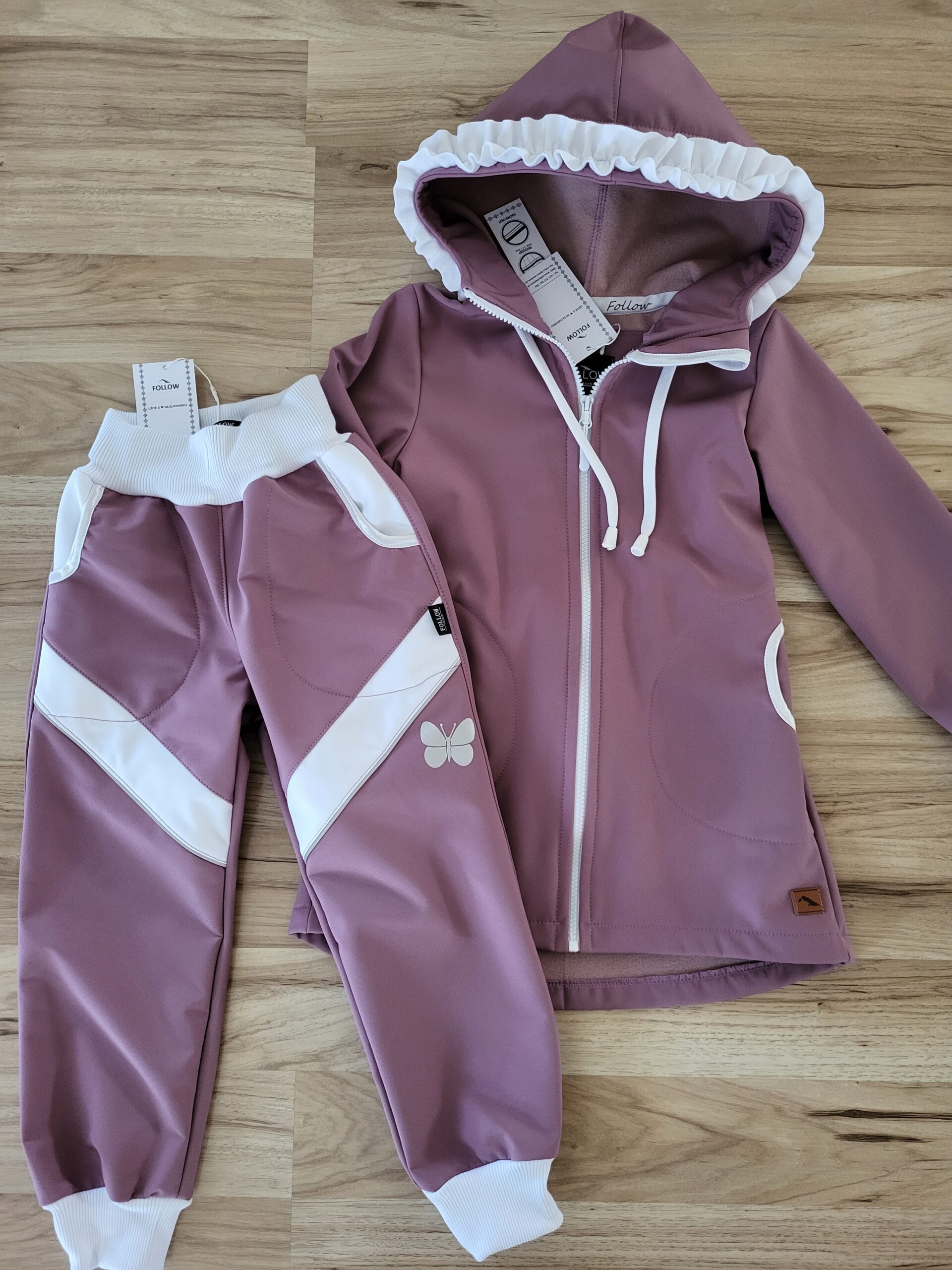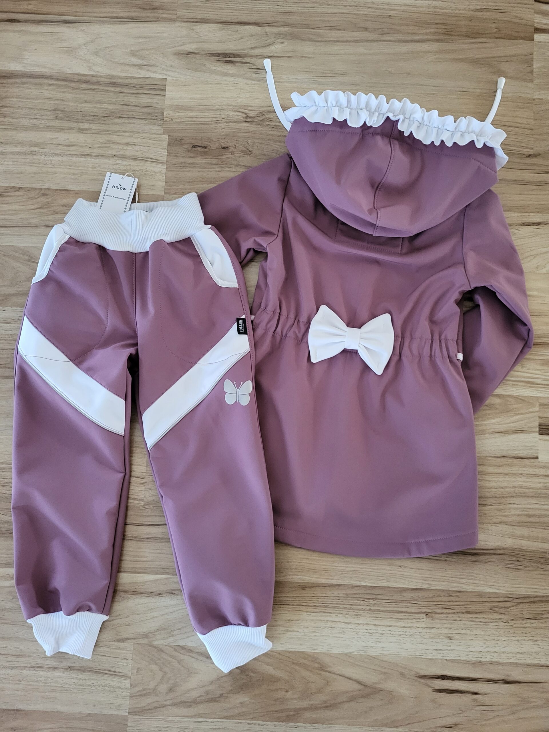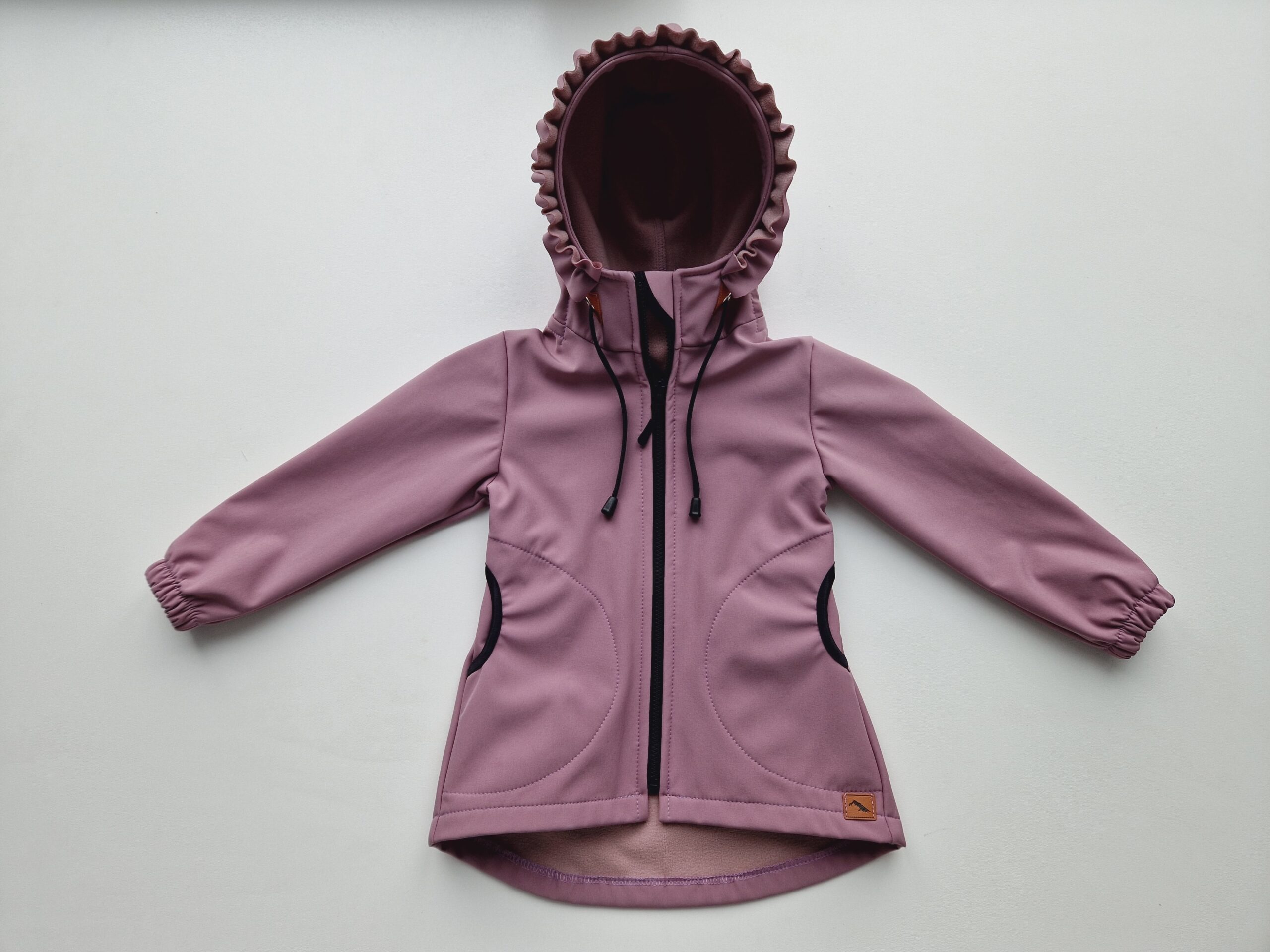 Štýlová softshellová bunda ušitá zo zimného softshelluje . Je predĺženého strihu s kapucňou, vreckami, vzadu stiahnutá gumou. Rukávy sú ukončené s riasením do gumičky. Vnútorná časť je z fleecu. Bunda je ozdobená riasenkami a mašľou. Mašľa je vo farbe riasenky ale ak si prajete inú farbu mašle, prosím napíšte do poznámky v objednávke. Perfektne sedí, je pohodlná. Šnúrka v kapucni je voliteľná iba od veľkosti 140. K bunde si môžete doladiť čiapku , rukavice alebo nohavice