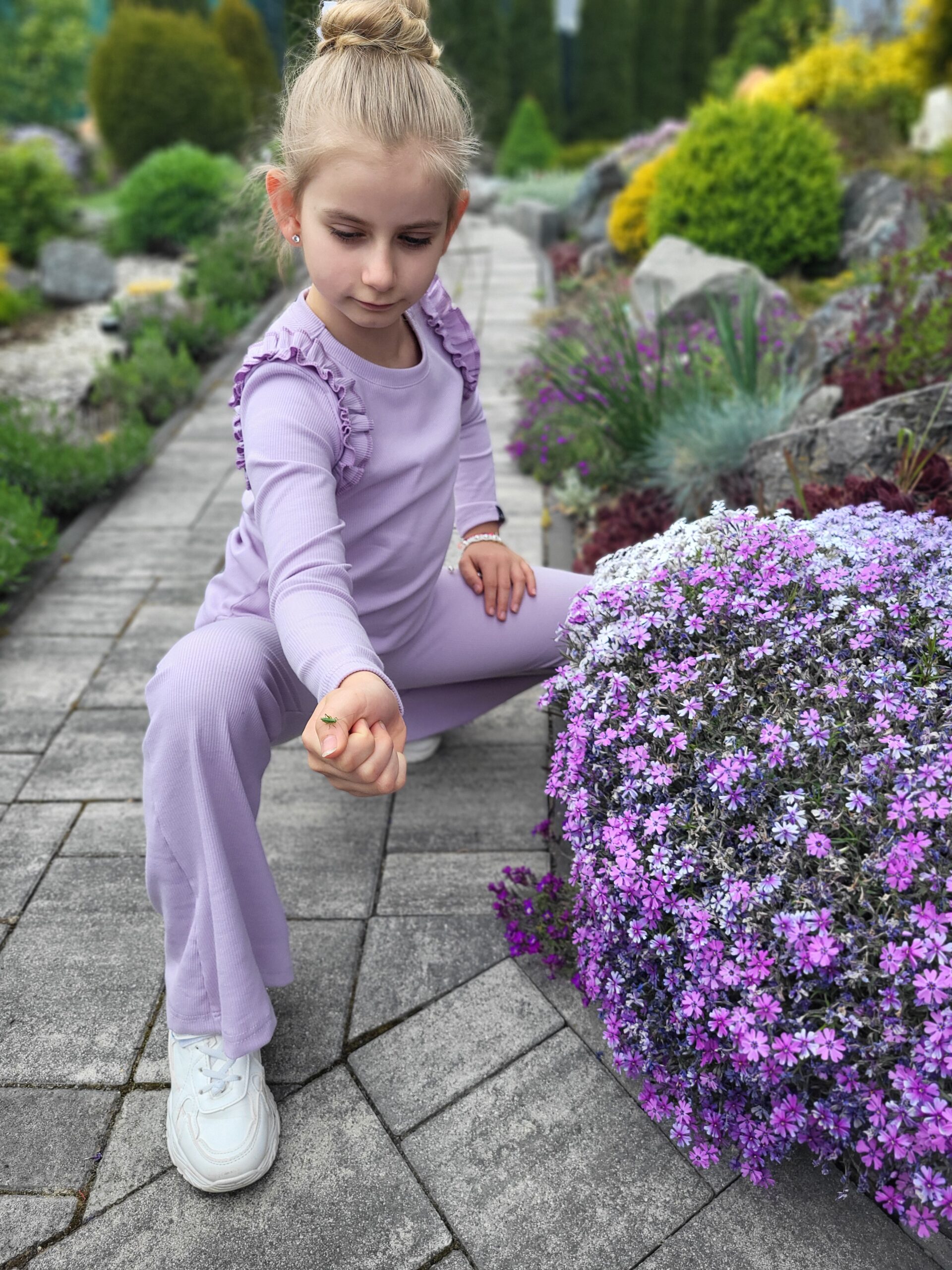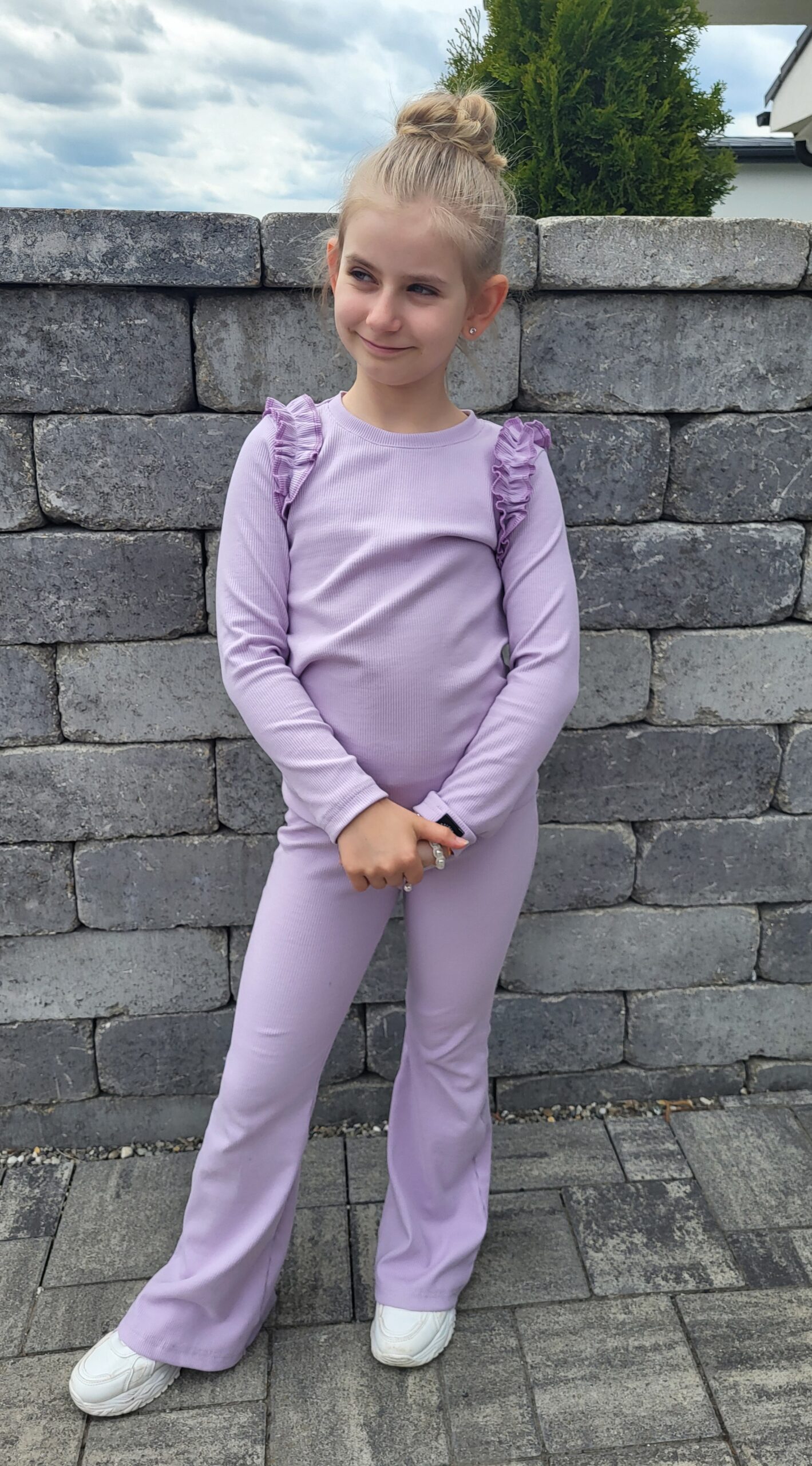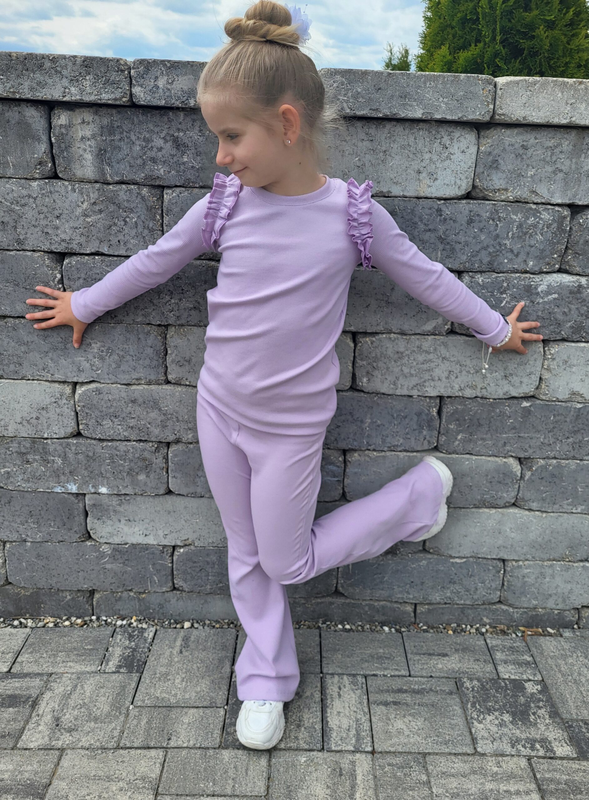 Pohodlná elastická súprava: tričko s riasenkami a zvonové legíny z príjemného bavlneného úpletu.