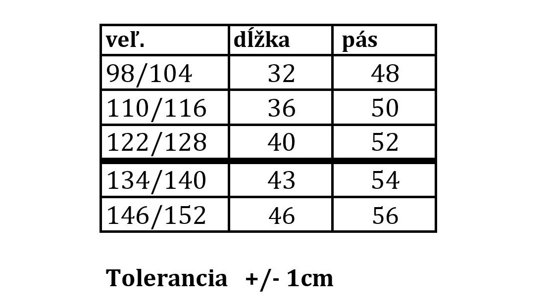 VEĽKOSTNÁ TABUĽKA: